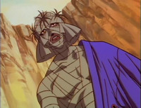 Shishio doesn't believe that Kenshin understands the laws of nature, philosophizes about the survival of the fittest through chaos and not just a worthless mirage of peace. Shishio then uses the Guren Kaina attack, the second of his Secret Sword technique, giving Kenshin a concussion. Saito suddenly busts through the door, using his Gatotsu First Stance, executing the Ishiki attack. However, Shishio is protected by a metal plate in his forehead. After trying the rest of his Gatotsu stances, Saito soon gets knocked out by Shishio. Even Sanosuke attempts to attack Shishio, but to no avail. It is then that Aoshi appears to engage in combat with Shishio.