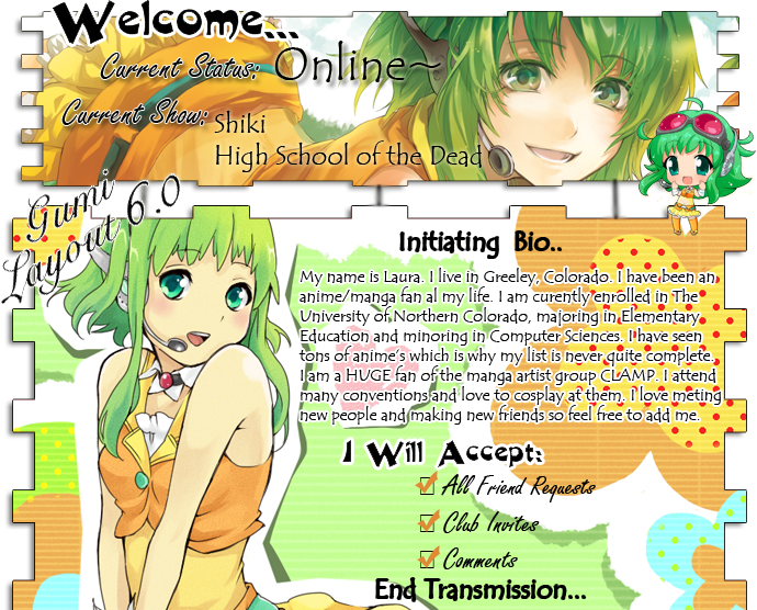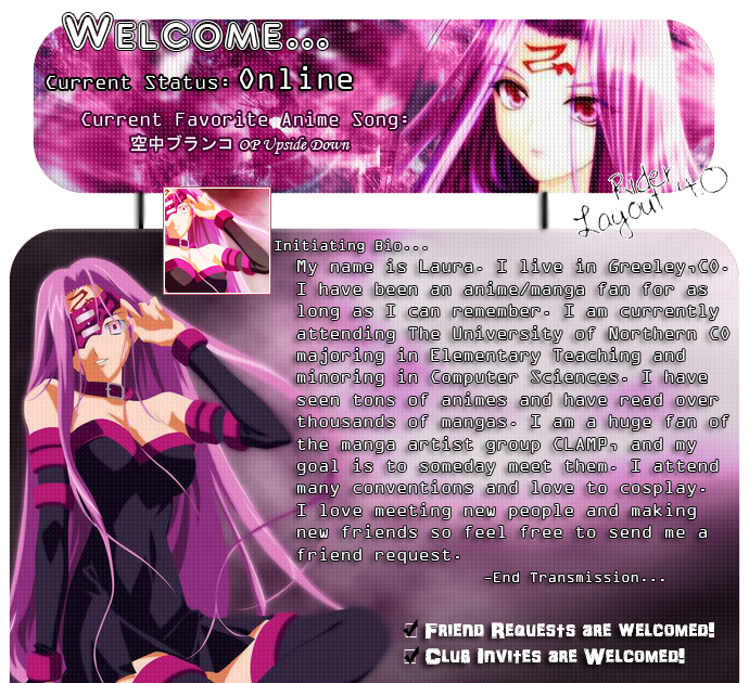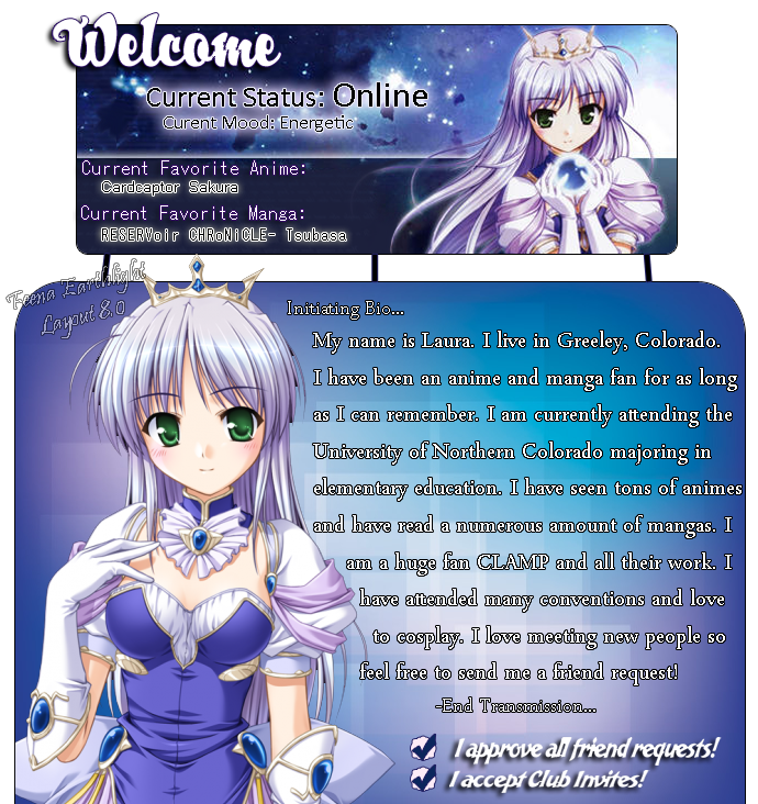 These are just some of the layouts I have made for my profile and profile's of friends. I always try to pick 1 character as my layout's theme, then make a layout, profile pic and avatar to go with it. Enjoy!