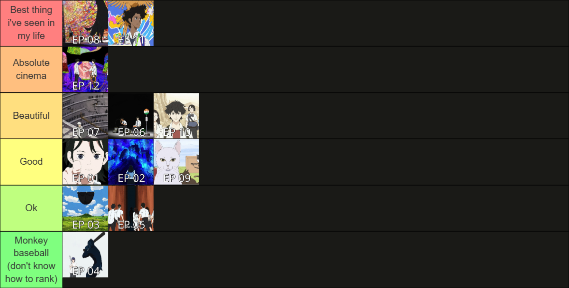 I was bored so i made a personal tier list of the episodes of Sonny Boy. This anime is one of the best pieces of media i've ever seen, it's very special to me.