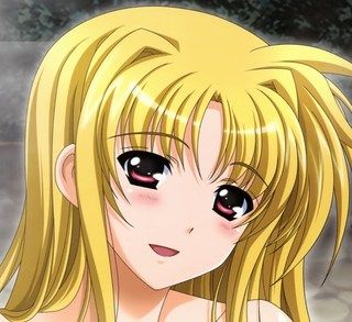 Hair: Riro's hair is a bit odd. It's blond, which usually means I don't like the color. In fact, there's no reason for me to like her hair color so there's nothing strange there. Her style is more the odd part. First off, the normal portions: She has a very nice hime cut in front. Or at least blunt bangs. She also has twintails which aren't that strange until you realize that her hair is nearly her height (though considering her height that's only partially surprising). The oddest part of her hair is that her twintails tend to flow out of two decorations on the sides of her head. It makes her hair look like a fountain, in a way.