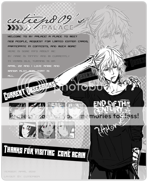 cutiep809 (President) BT-kun (Secretary) Injection (Secretary) KanxHaru-chan (Secretary) kappuchu (Secretary) MiuMiu_Alice (Secretary) ReenaMisa (Secretary) rooj75 (Secretary) rose93 (Secretary) SizzlingTear2 (Secretary) sxndz (Secretary) xTenshiAi (Secretary) Yoruichi (Secretary) Club Type This is a private club.Members must request access and be approved by a Secretary of this club before joining. Club details, pictures, comments and club discussions can be viewed by any user, regardless of whether they are a member of the club or not. Club Secretary can change the Club Type at any time. For more information on Club Types, click here. Anime Relations Character Relations