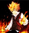 Tsuna is a junior-high student and an unwilling mob-boss-in-training. The reason Tsuna was recruited was because the first Vongola boss moved to Japan. Tsuna is his great-great-great grandson. The other candidates for the position of the head of the Vongola family died. Before Reborn finds Tsuna, Tsuna is known as "No Good Tsuna" for his poor grades and bad luck. When shot with the Vongola family's deathperation shot, Tsuna would normally die, but since he has regrets in his life(i.e. not telling Kyoko Sasagawa that he loves her), so he comes back as a powerful mostly-naked warrior with a flame on his forehead and blanked out eyes (his boxers somehow survive). After five minutes, he turns back into normal Tsuna. (Source: Wikipedia)