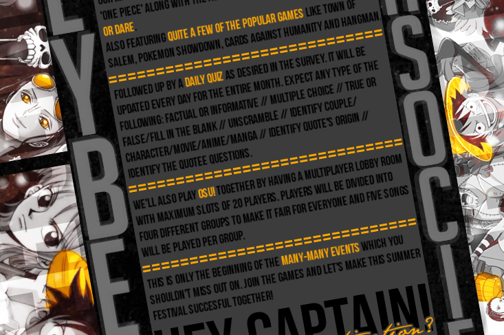 Information Daily Quiz Cards Against Humanity Hangman Game Pokemon Showdown Town of Salem Osu! One Piece Mafia Truth Or Dare (ToD) Anime/Manga Challenge 20 Questions Club Members Club Pictures