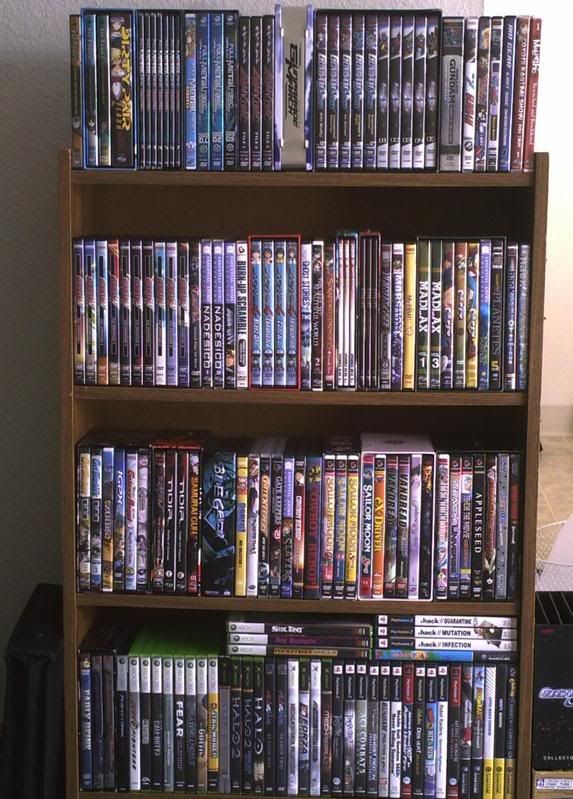 I don't have a photo of my anime DVD collection yet, but I write anime dvd reviews for a dvd site (I cover ADV and Funimation titles), so funimation and ADV send me random things all the time. Thus, my DVD collection is growing steadily with a small pile of new discs each month.