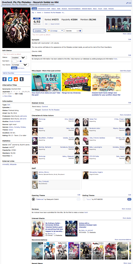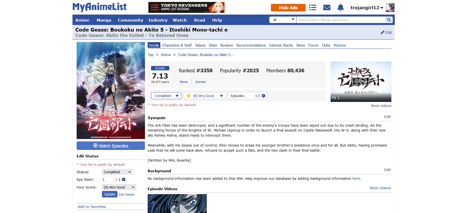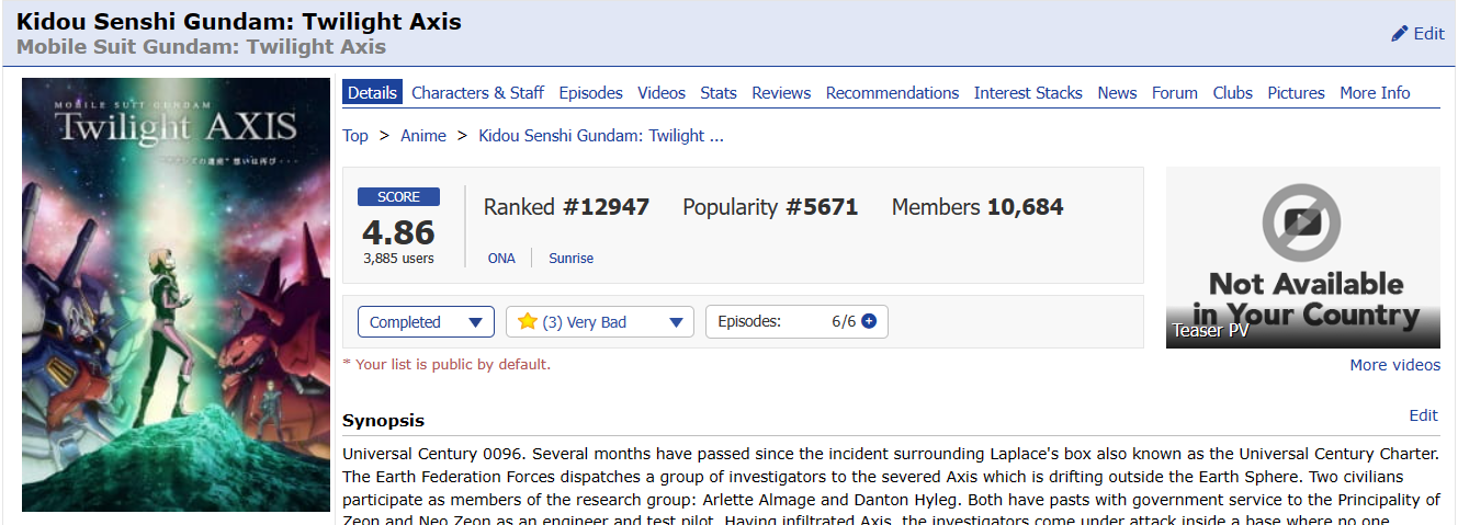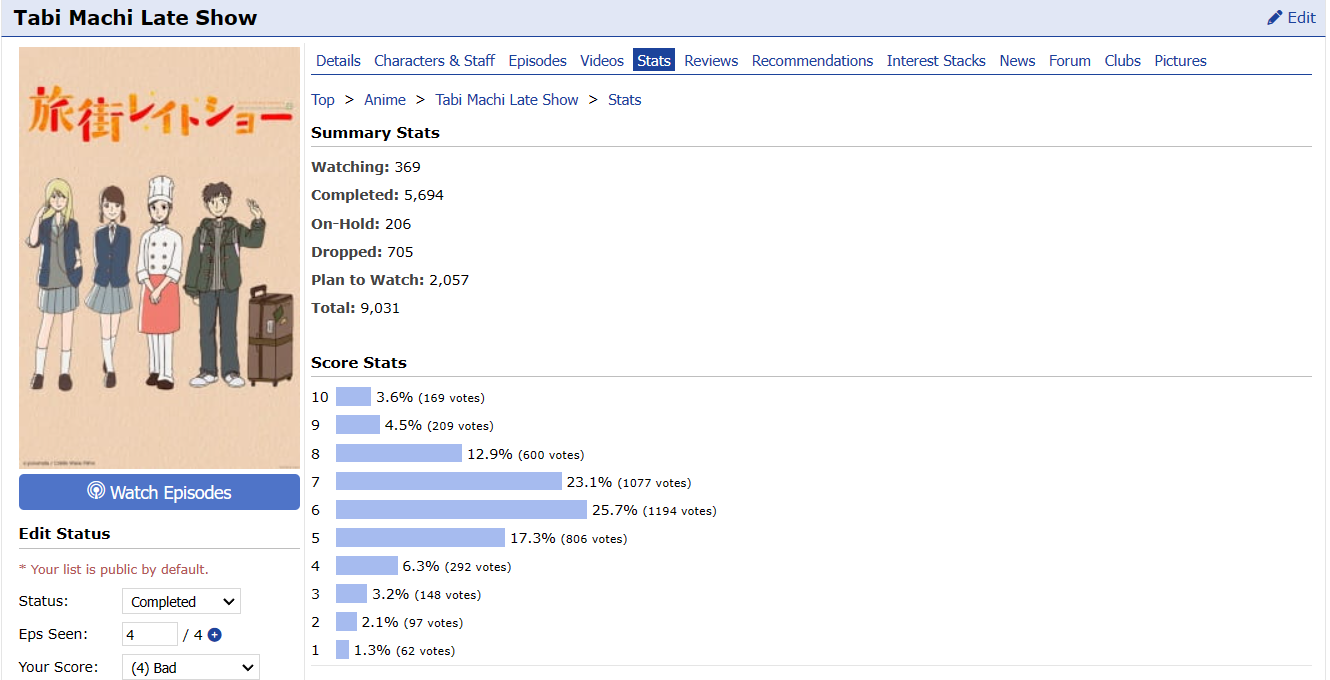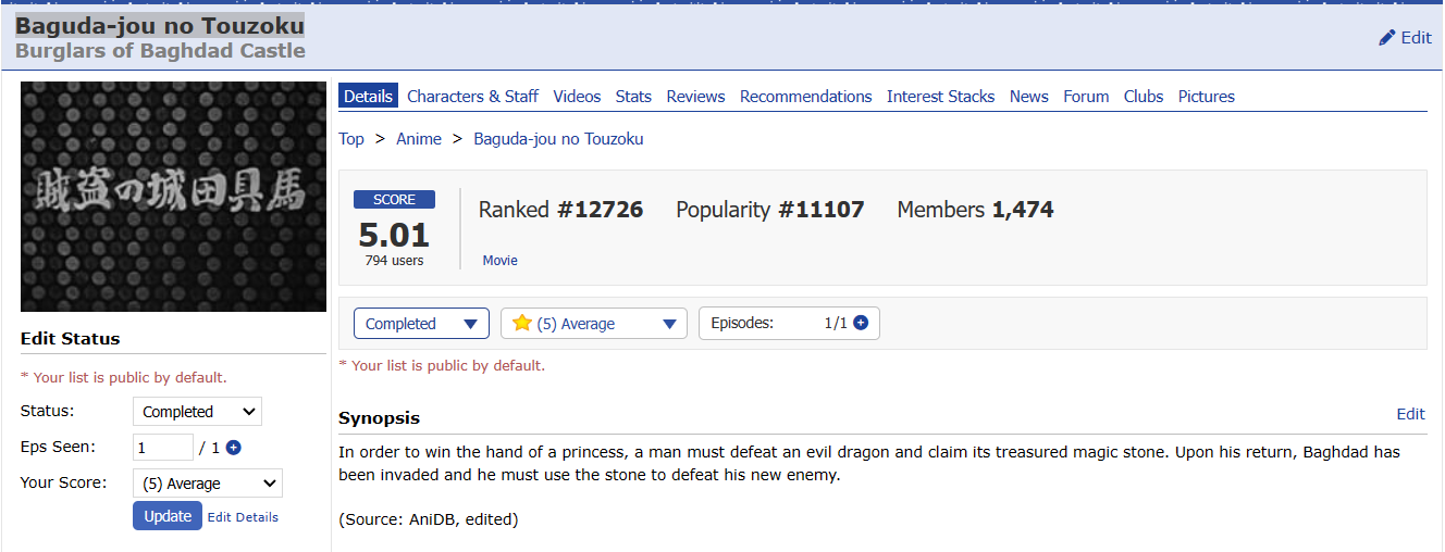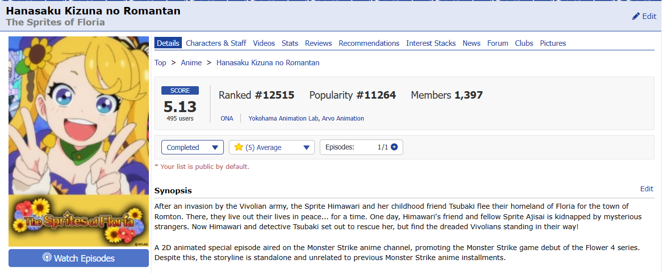 Start Date: 15 December 2021 (previously started but not completed) End Date: 14 April 2023 PROGRESS: 20/20 | HoF Checklist WATCHING | PLANNING | COMPLETED #01 01 ▸ Watch an anime that aired on the 1st day: Given: Uragawa no Sonzai 02 ▸ Watch a series that aired in the 1st month: Sabikui Bisco 03 ▸ Watch a series that aired in a year ending in 1: Hoshi wo Ou Kodomo 04 ▸ Watch a series with 1 in the main title: Fruits Basket 1st Season 05 ▸ Watch a series with 1 in an alternative title: Vanitas no Karte: En Route Pour le Gévaudan 06 ▸ Watch a series with a main character that has 1 in their name: Another Kouichi Sakakibara 07 ▸ Watch a series with only 1 character listed: Shingeki no Kyojin: The Final Season Part 2 Screenshot 08 ▸ Watch a series ranked with 1 in it: Sasaki to Miyano Screenshot 09 ▸ Watch a series with a popularity that has 1 in it: Blue Period Screenshot 10 ▸ Watch a series favorited 100 to 199 times: Shigatsu wa Kimi no Uso: Moments 137 favorites | Screenshot 11 ▸ Watch a series with total members between 10,000 and 19,999: Shika no Ou: Yuna to Yakusoku no Tabi Screenshot 12 ▸ Watch a series with only 1 episode: Ookami Kodomo no Ame to Yuki 13 ▸ Watch a series with 21 min. per ep.: Series 14 ▸ Watch a series with only 1 recommendation: Shokei Shoujo no Virgin Road Screenshot 15 ▸ Watch a series with only 1 forum discussion thread: SK∞: Crazy Rock Jam Screenshot 16 ▸ Watch a series with the most number of votes in 1: Series 17 ▸ Watch a series with the least number of votes in 1: Mirai no Mirai Screenshot 18 ▸ Watch a series that was reviewed on day 1: Tokyo Godfathers Review 19 ▸ Watch an anime tagged as Action, Shounen Ai, Thriller, or Vampire: Vanitas no Karte Part 2 20 ▸ Watch an anime from Sunrise or Amuse: Code Geass: Hangyaku no Lelouch Alternate ▸ Watch an anime that aired on the 11th day: Suzume no Tojimari Alternate ▸ Watch a series with a rating that has 1 in it: Buddy Daddies Screenshot |