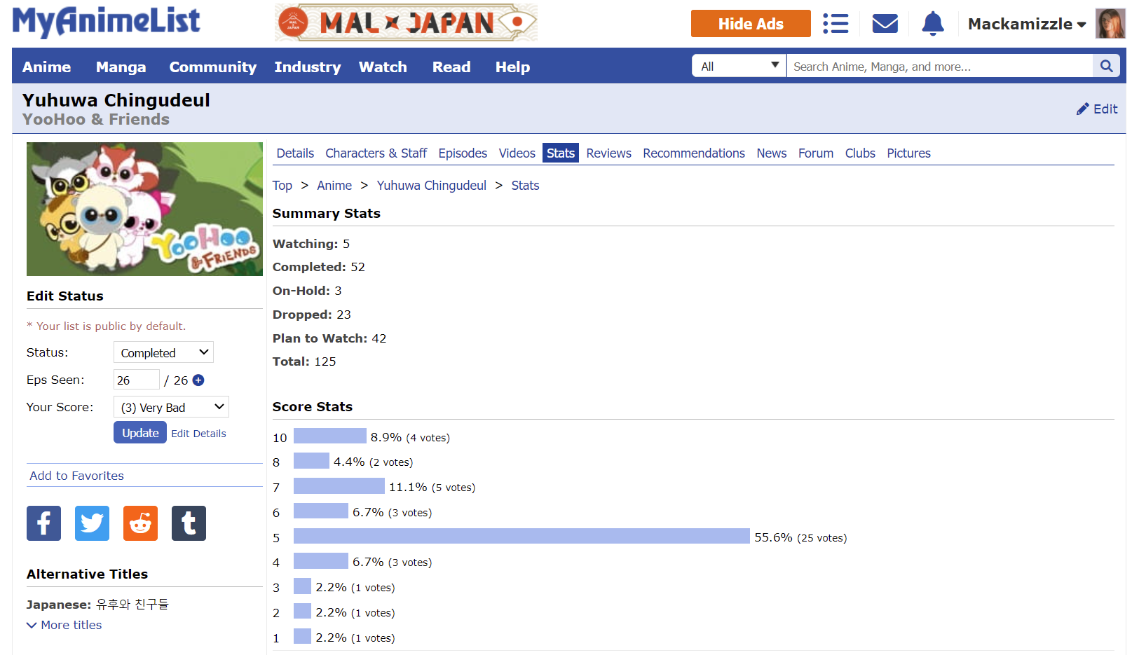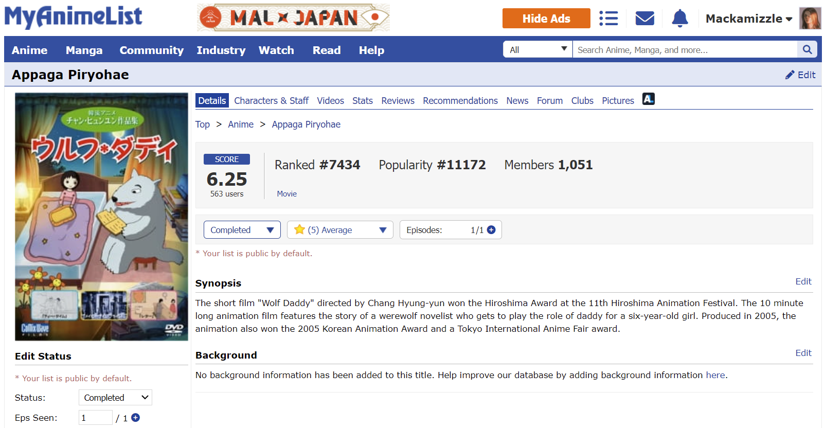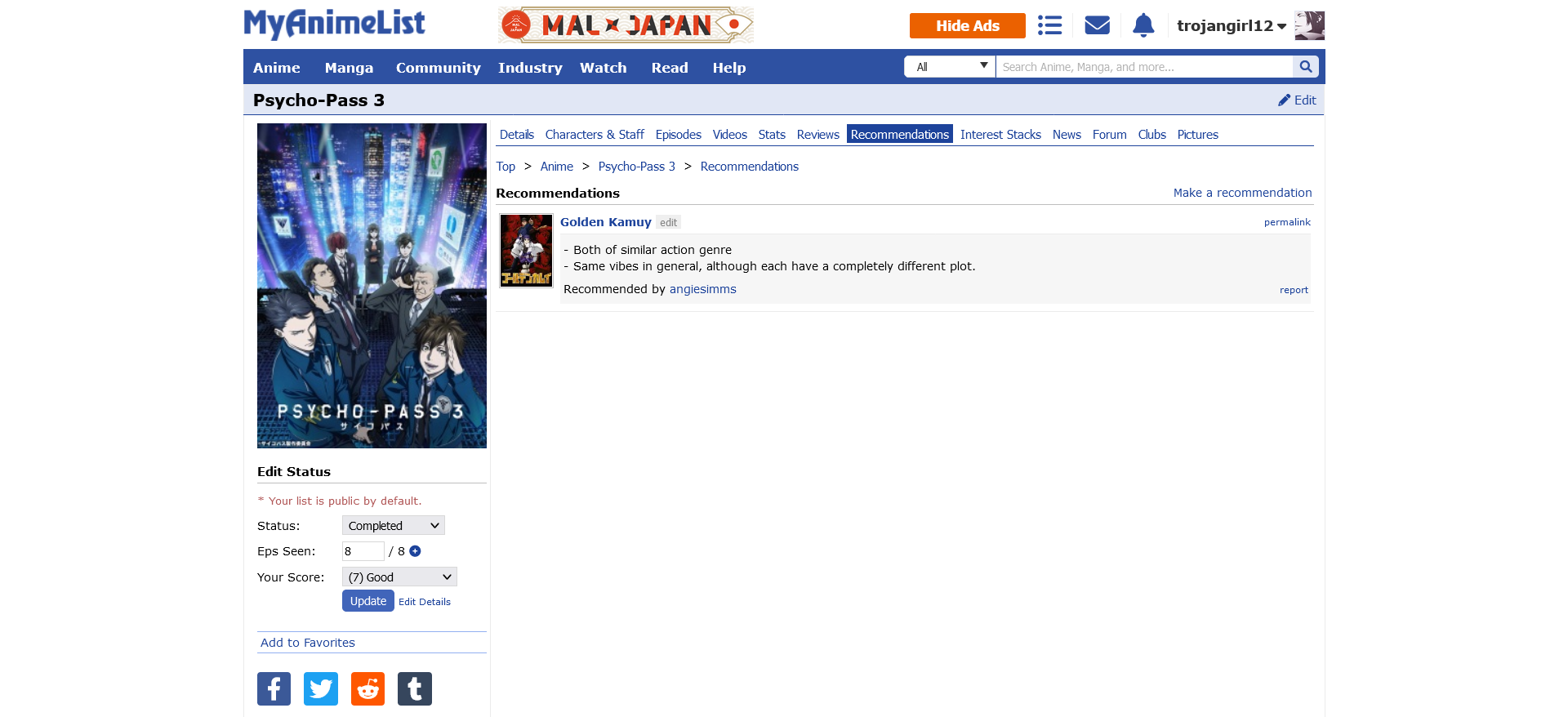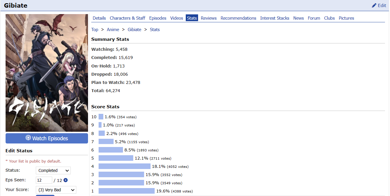 Start Date: 15 December 2021 (previously started but not completed) End Date: 14 April 2023 PROGRESS: 20/20 | HoF Checklist WATCHING | PLANNING | COMPLETED #01 01 ▸ Watch an anime that aired on the 1st day: Given: Uragawa no Sonzai 02 ▸ Watch a series that aired in the 1st month: Sabikui Bisco 03 ▸ Watch a series that aired in a year ending in 1: Hoshi wo Ou Kodomo 04 ▸ Watch a series with 1 in the main title: Fruits Basket 1st Season 05 ▸ Watch a series with 1 in an alternative title: Vanitas no Karte: En Route Pour le Gévaudan 06 ▸ Watch a series with a main character that has 1 in their name: Another Kouichi Sakakibara 07 ▸ Watch a series with only 1 character listed: Shingeki no Kyojin: The Final Season Part 2 Screenshot 08 ▸ Watch a series ranked with 1 in it: Sasaki to Miyano Screenshot 09 ▸ Watch a series with a popularity that has 1 in it: Blue Period Screenshot 10 ▸ Watch a series favorited 100 to 199 times: Shigatsu wa Kimi no Uso: Moments 137 favorites | Screenshot 11 ▸ Watch a series with total members between 10,000 and 19,999: Shika no Ou: Yuna to Yakusoku no Tabi Screenshot 12 ▸ Watch a series with only 1 episode: Ookami Kodomo no Ame to Yuki 13 ▸ Watch a series with 21 min. per ep.: Series 14 ▸ Watch a series with only 1 recommendation: Shokei Shoujo no Virgin Road Screenshot 15 ▸ Watch a series with only 1 forum discussion thread: SK∞: Crazy Rock Jam Screenshot 16 ▸ Watch a series with the most number of votes in 1: Series 17 ▸ Watch a series with the least number of votes in 1: Mirai no Mirai Screenshot 18 ▸ Watch a series that was reviewed on day 1: Tokyo Godfathers Review 19 ▸ Watch an anime tagged as Action, Shounen Ai, Thriller, or Vampire: Vanitas no Karte Part 2 20 ▸ Watch an anime from Sunrise or Amuse: Code Geass: Hangyaku no Lelouch Alternate ▸ Watch an anime that aired on the 11th day: Suzume no Tojimari Alternate ▸ Watch a series with a rating that has 1 in it: Buddy Daddies Screenshot |