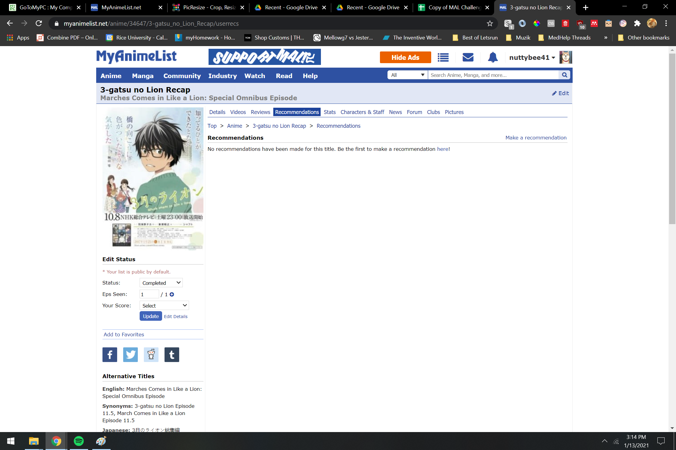 Initial Post Number: #712♬ 🔷 Challenge Start Date: January 3rd, 2021 🔶 Challenge Finish Date: MONTH DAY, YEAR 📣 Link to your completed anime list: https://myanimelist.net/animelist/Mako275?status=2 📣 Link to your Anime+: http://graph.anime.plus/mako275/profile ⏰ Completed Anime (at sign-up): 79 ⏰ Time Zone: CST 🚩 Card Number: #03 🚩 Card Level: Bingo Addict 🚩 Restriction: N/A 📚 Anime in Forum Set: N/A 📚 Legend: Watching - Completed - Inactive/Plan to Watch ⚔️ Challenge list: