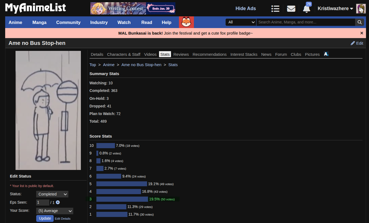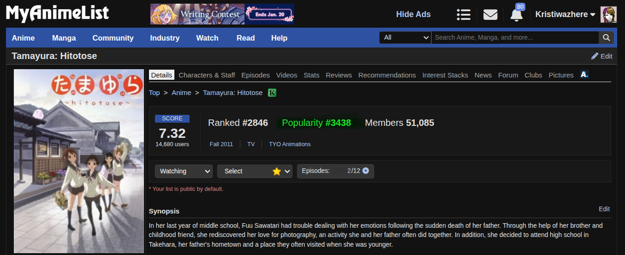 Anime Milestones (More milestones listed on Profile.) 200 Completed = Sword Art Online II (09.02.2024) 300 Completed = Mameshiba (12.27.2024) 400 Completed = Kimi no Na wa. (06.27.2025) 30 Days = 06.06.2024 40 Days = 09.27.2024 50 Days = 04.01.2025 |