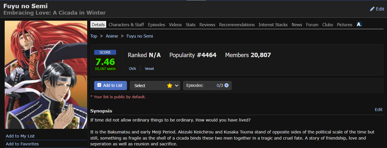 ✨ May 2023 Challenge ✨ Any type is allowed, but must be equal to or longer than 15 minutes (total). Starting Date: May 01 Ending Date: May 31 ╚══════ ∘◦ ✾ ◦∘ ══════╝ Legend:【X】Not Started |【O】Watching |【✓】Completed 【✓】Watch a Psychological Thriller, a Historical Fiction, or a Supernatural Romance anime: Yuukoku no Moriarty Part 2 | Historical Fiction — State the tag used; Must appear on the tag list. 【✓】Watch an anime with a Straight Man, Yamato Nadeshiko, Delinquent, or Dojikko character: Hataraku Saibou | Dojikko | AE3803 some alternate links: Y.N., delinquent, dojikko (clumsy) — State the tag used; Must appear on the tag list; State the character used; Can be main or supporting; Character must appear listed on the provided tag list and their site (not necessarily on MAL). 【✓】Watch an anime with a score of 7.50 or lower, based on at least 10,000 users' scores: Psycho-Pass 2 — Add a screenshot with the requested information, since there's a high chance it might change by inspection. 【✓】Watch an anime with a character who has a physical disability or chronic illness: Josee to Tora to Sakana-tachi | Josee | Physical Disability — State the tag used; Must appear on the tag list; State the character used; Can be main or supporting; Character must appear listed on the provided tag list and their site (not necessarily on MAL). |
