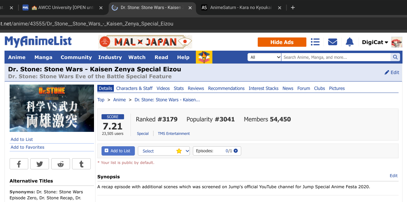 🏫 AWCC University Challenge 🏫 📚 Username: DigiCat 📚 Link to your completed anime list: https://myanimelist.net/animelist/DigiCat?status=2 📚 Link to your School Checklist: https://anime.jhiday.net/hof/challenge/school?user=DigiCat#challengeItems 🧪 Degree: (select one and delete the others) — Associate: achieve 4 credits (4 subjects, 12 courses, 12 series) ⚾ Starting Date: June 01, 2024 ⚾ Finishing Date: August 14, 2024