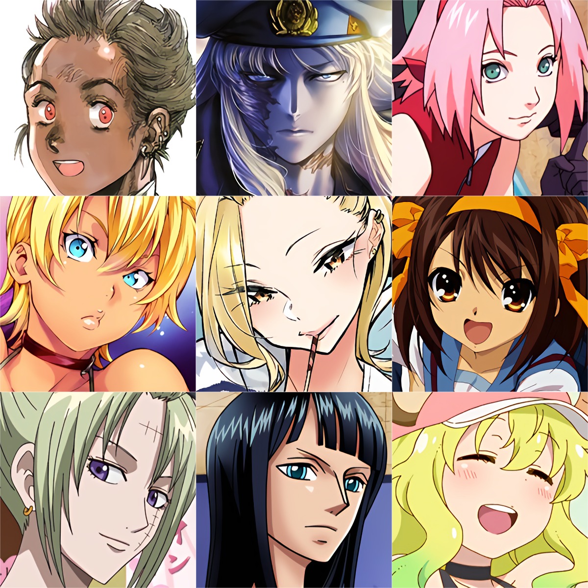 | My "waifus" are the ones in the middle row, but since this is a 3x3 I added 6 more |