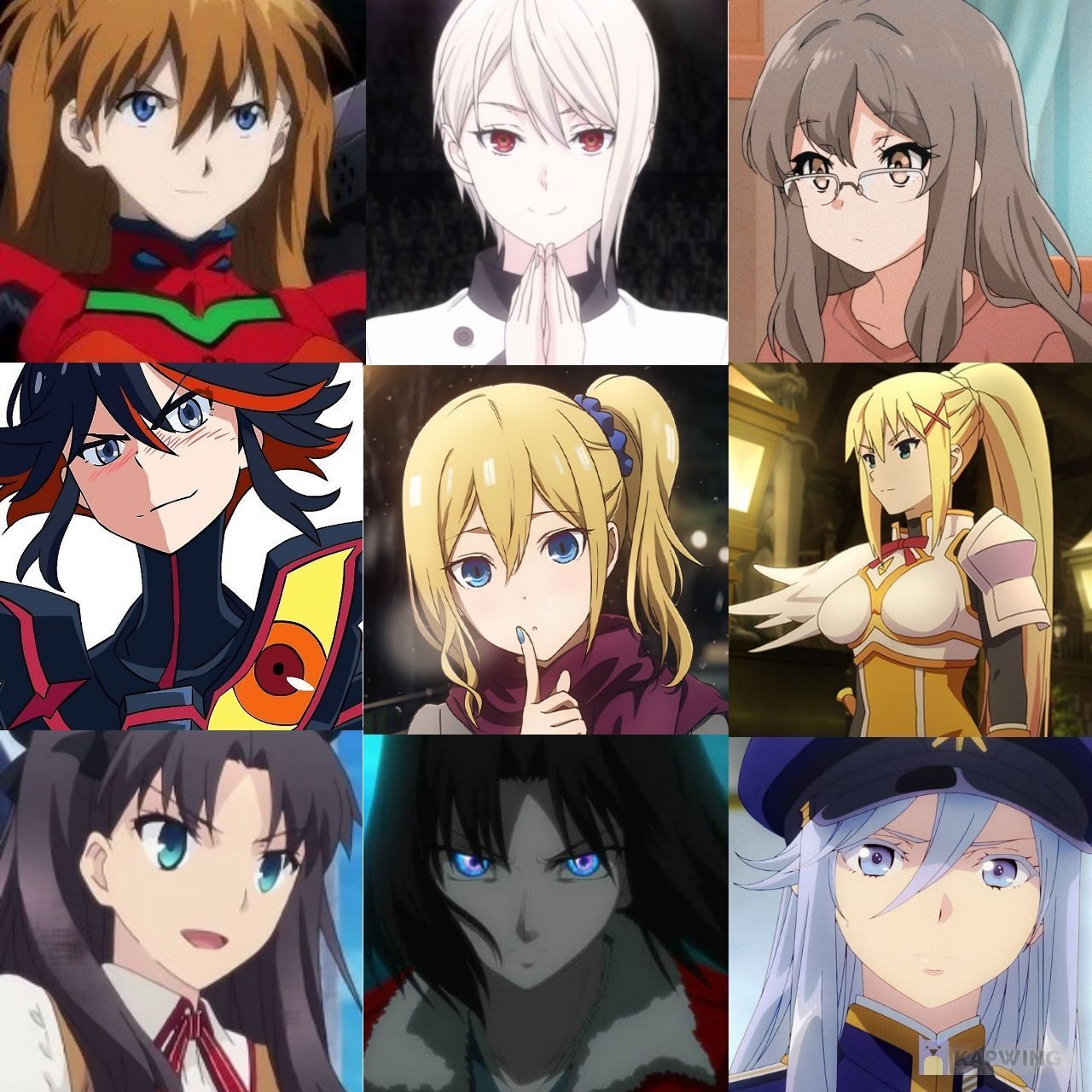 | Top left to bottom right: Asuka - Evangelion Alice - Shokugeki no soma Futaba - Bunny Girl Senpai Ryuko - Kill La Kill Hayasaka - Kaguya-sama Darkness - Konosuba Rin - Fate Shiki - Kara no kyoukai Vladilena - 86 |