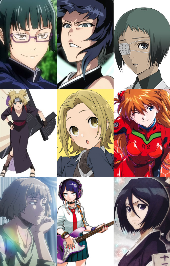 From left to right Nami (One Piece) Robin (One Piece) Kurisu (Steins Gate) Faye (Cowboy Bebop) Rukia (Bleach) Mitsuha (Your Name) Hayasaka (Kaguya sama) Maki (Jujutsu Kaisen) Erza (Fairytail) |