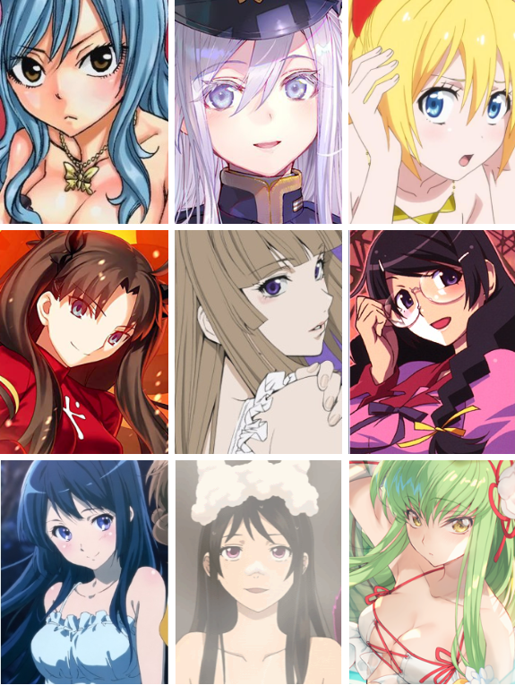 from top left to bottom right: Juvia Lockser (Fairy Tail) Lena (86) Chitoge Kirisaki (Nisekoi) Rin Tohsaka (Fate series) Aika Fuwa (Zetsuen No Tempest) Tsubasa Hanekawa (Monogatari series) Reina Kousaka (Hibike! Euphonium) Hiyori Iki (Noragami) C.C. (Code Geass) |