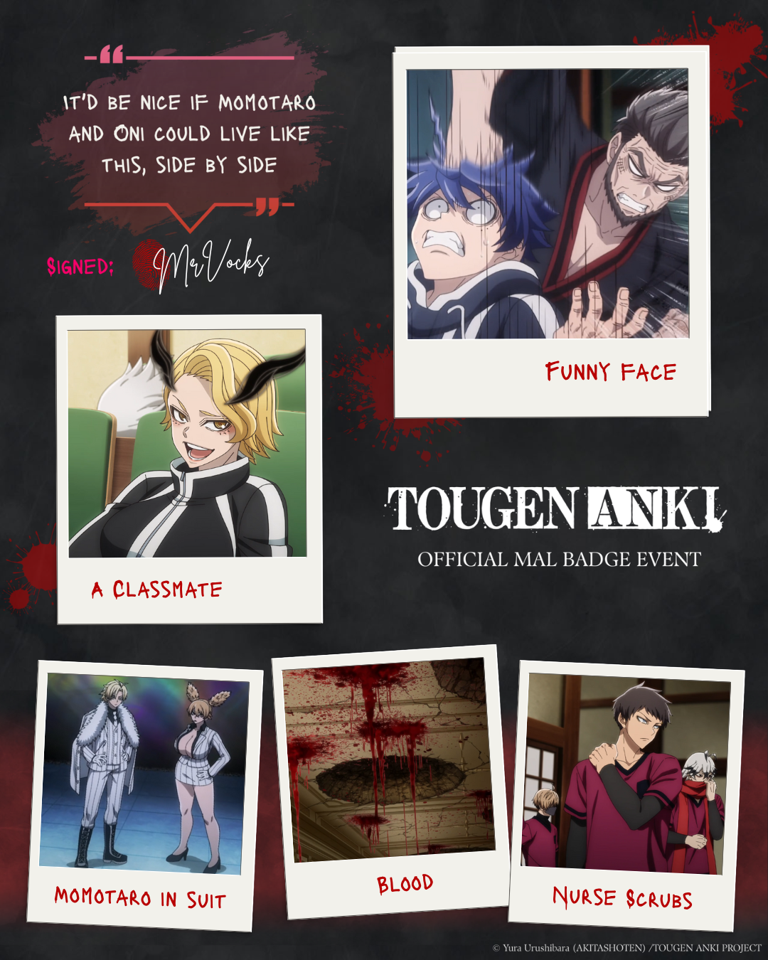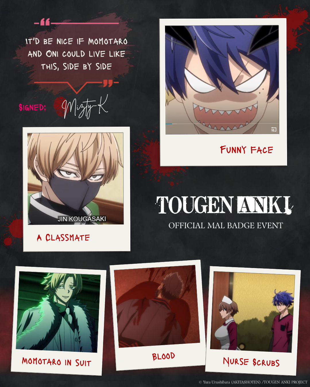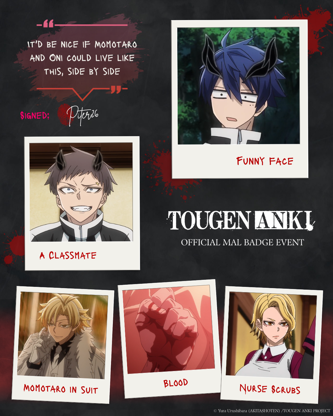 Awesome Blood Badge π©ΈβοΈ Thanks for the event (´• ω •`) 1 - Funny Face: episode #5 2 - A Classmate of Shiki's: episode #4 3 - Momotaro in a Suit: episode #1 4 - Blood: episode #2 5 - Nurse Scrubs: episode #5 |