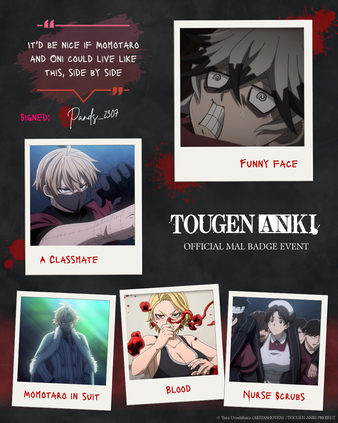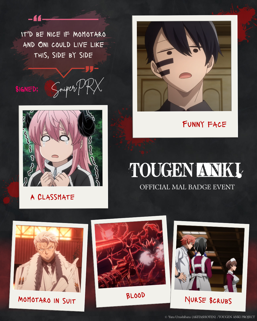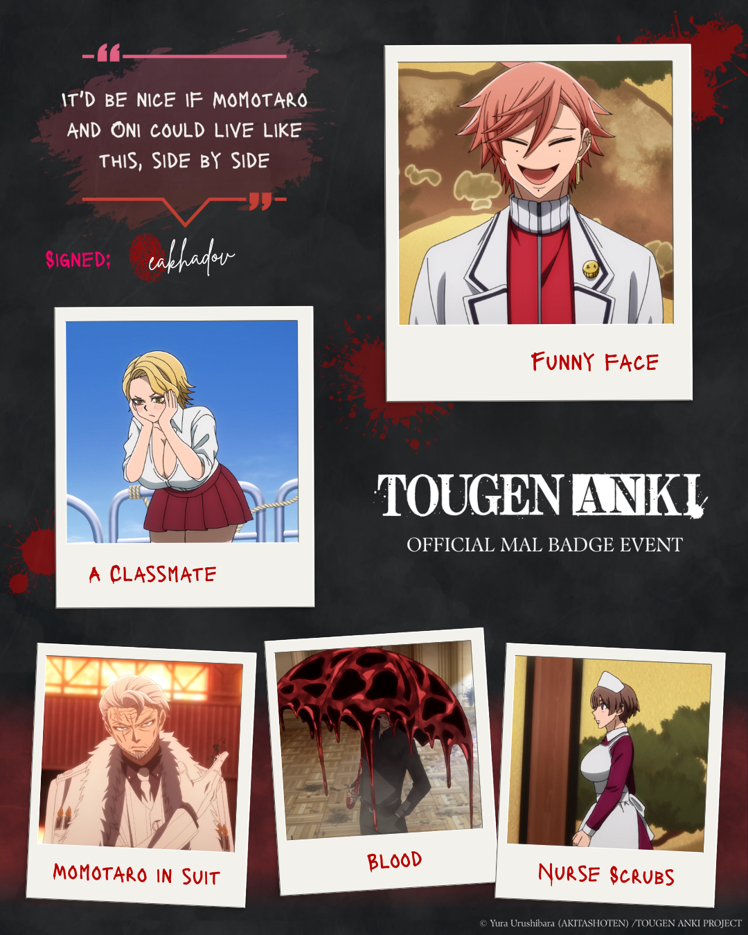 Awesome Blood Badge π©ΈβοΈ Thanks for the event (´• ω •`) 1 - Funny Face: episode #5 2 - A Classmate of Shiki's: episode #4 3 - Momotaro in a Suit: episode #1 4 - Blood: episode #2 5 - Nurse Scrubs: episode #5 |