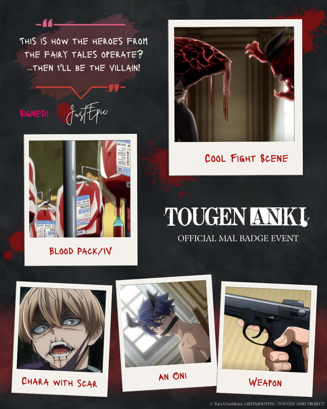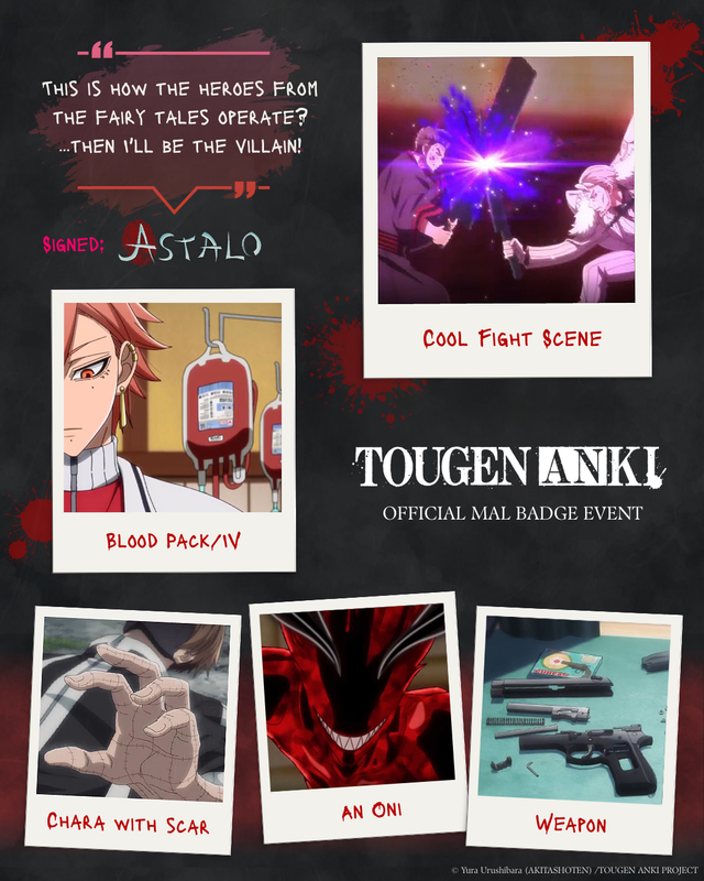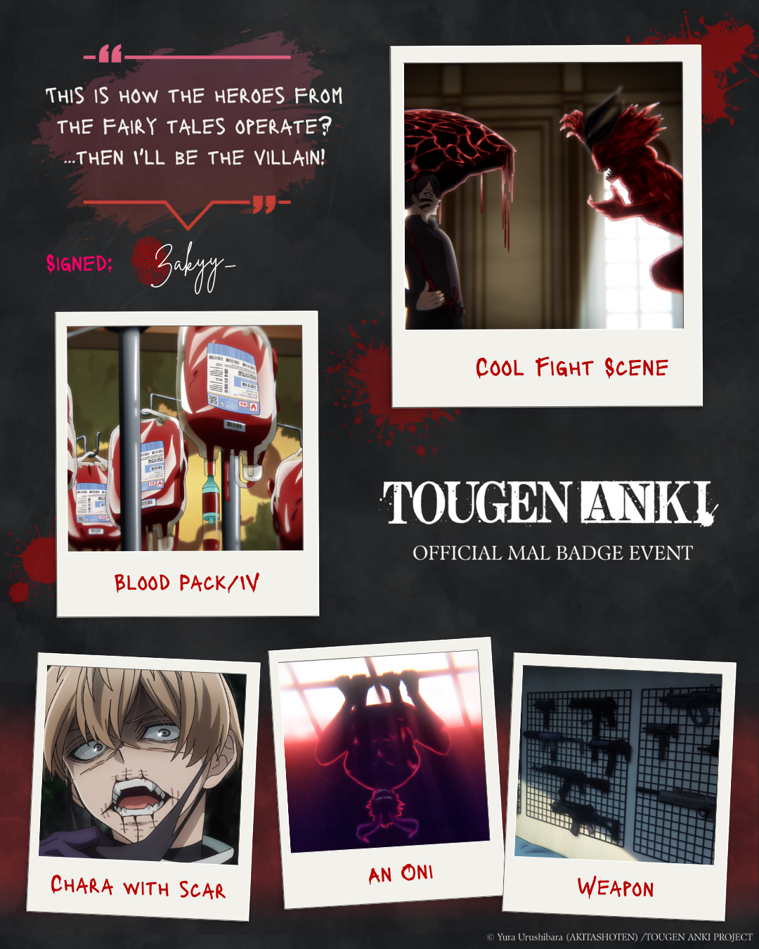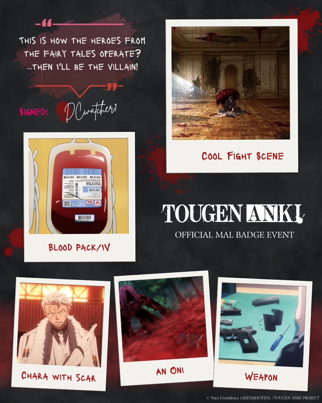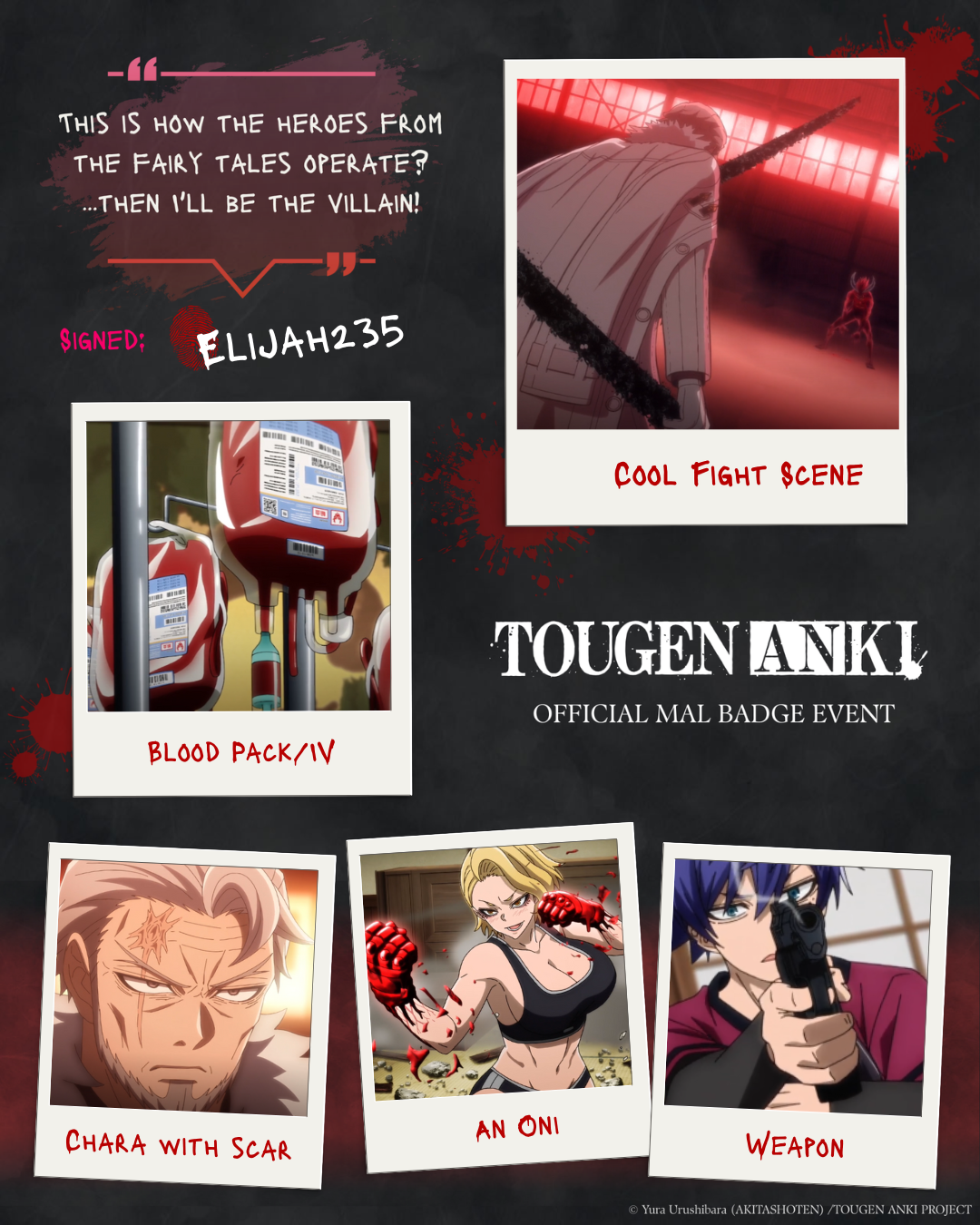 For the badge 1 - Cool Fight Scene: episode # 7 2 - Blood Pack/IV: episode # 5 3 - Character with a Scar: episode # 1 4 - An Oni: episode # 1 5 - A Weapon: episode # 2 |