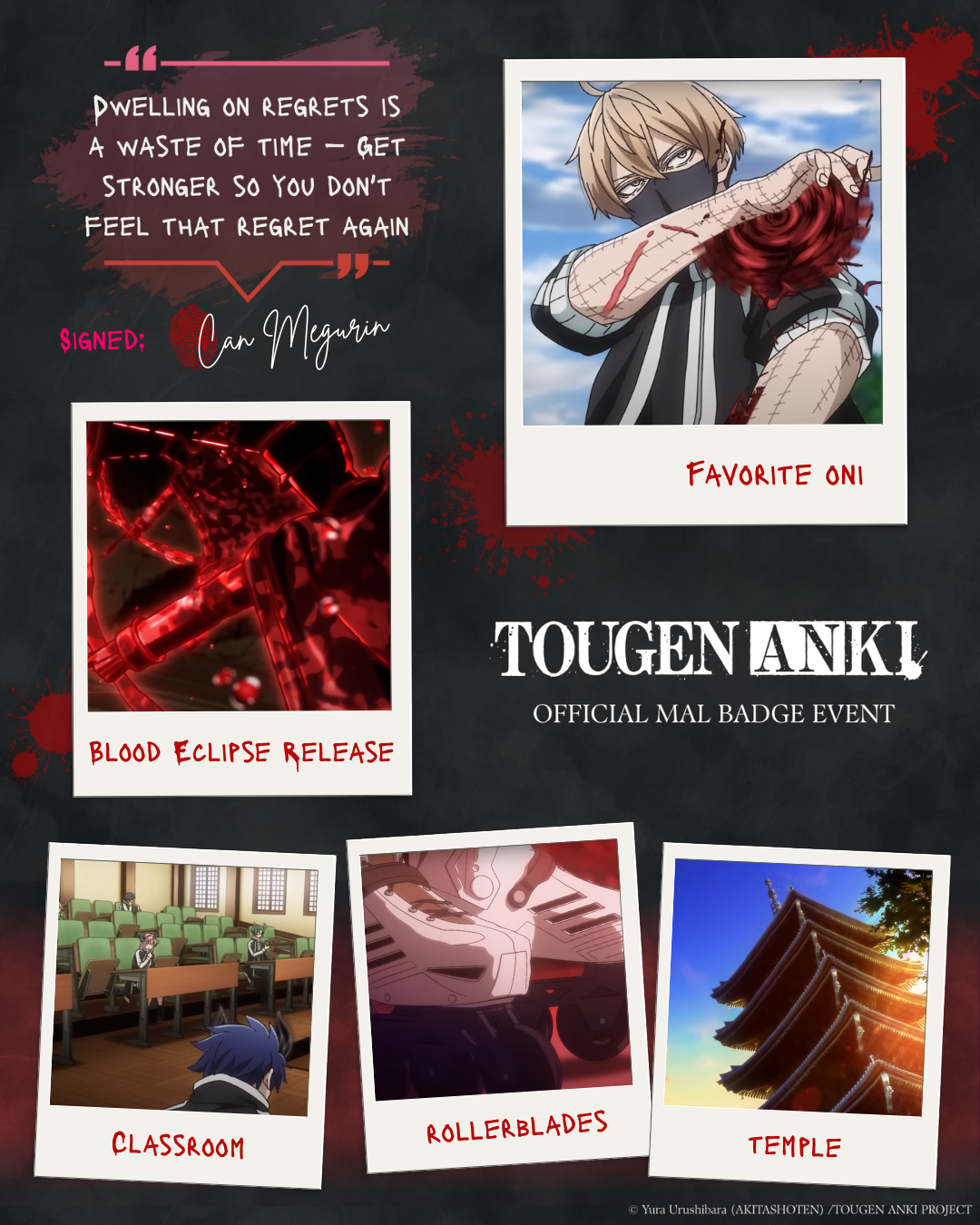 Thank you for the event!! Binged and enjoying the series so far! 1 - Favorite Oni: episode # 3 2 - Blood Eclipse Release: episode # 2 3 - Classroom: episode # 2 4 - Rollerblades: episode # 1 5 - Temple: episode # 6 |