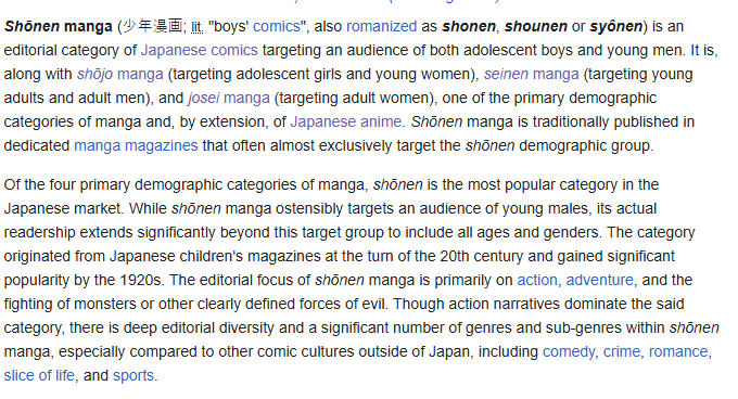 @stefanoiulli1999 It is also with shonen since once again it stands for teenage boys for the age of 13 to 18 and in Japan considered legal age of adult is 18. Meaning once again, authors within shonen magazines can target adult audience.