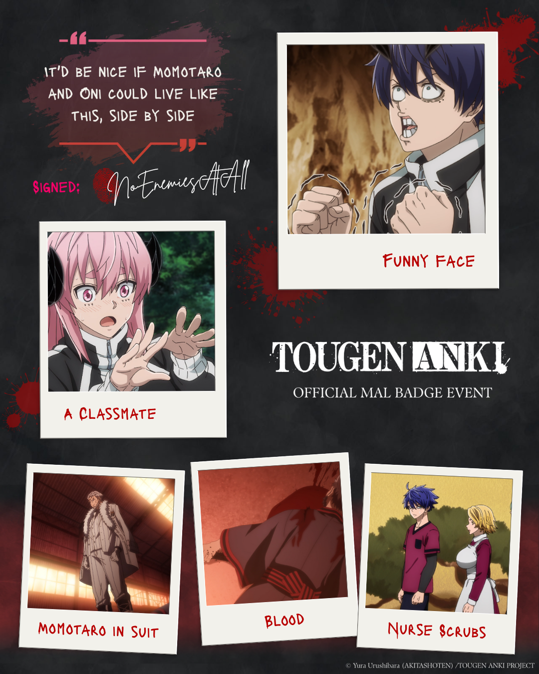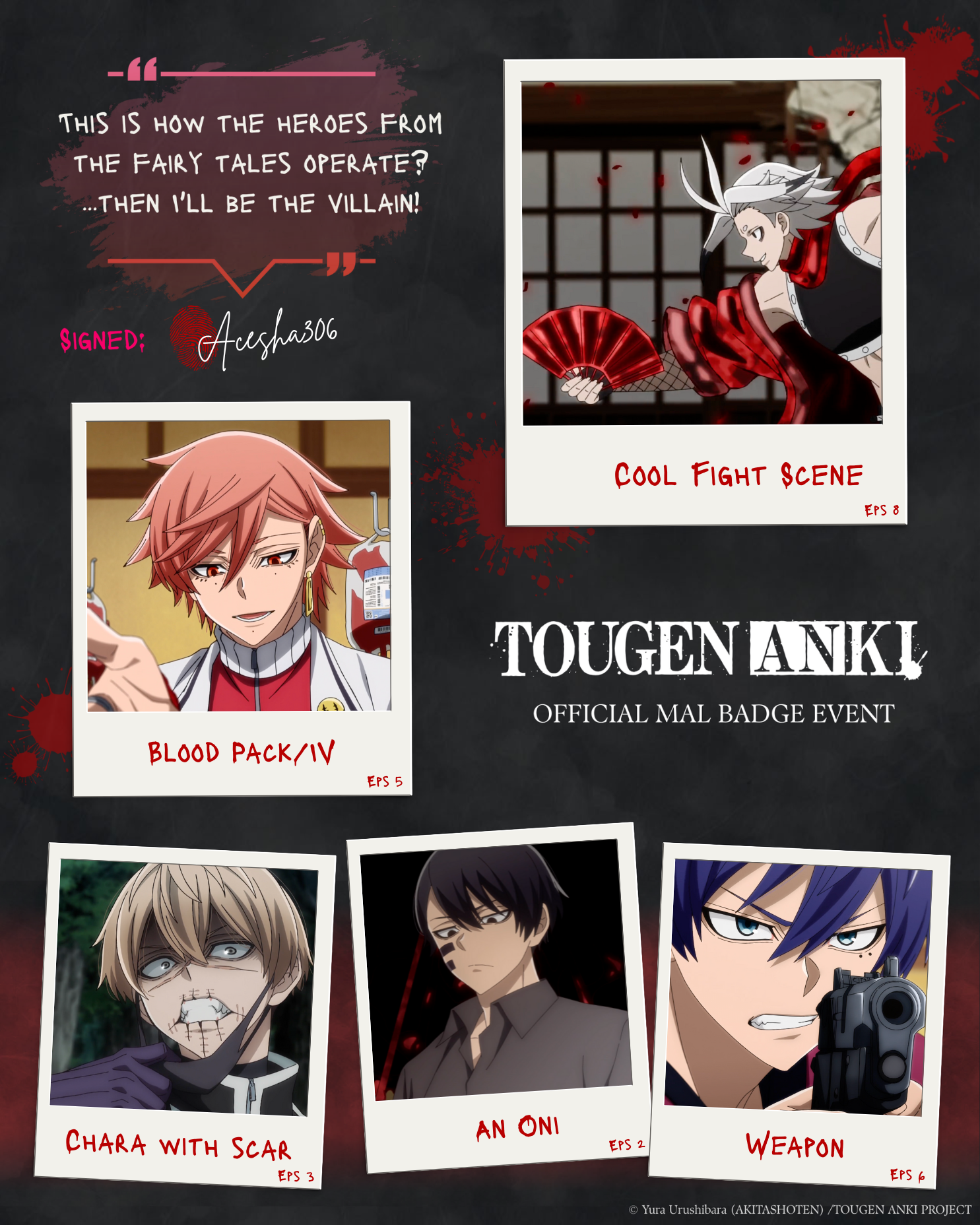 Done! Good anime so far! Thanks for the recommendation and for creating this event. 1 - Cool Fight Scene: episode #5 2 - Blood Pack/IV: episode #5 3 - Character with a Scar: episode #1 4 - An Oni: episode #2 5 - A Weapon: episode #1 |