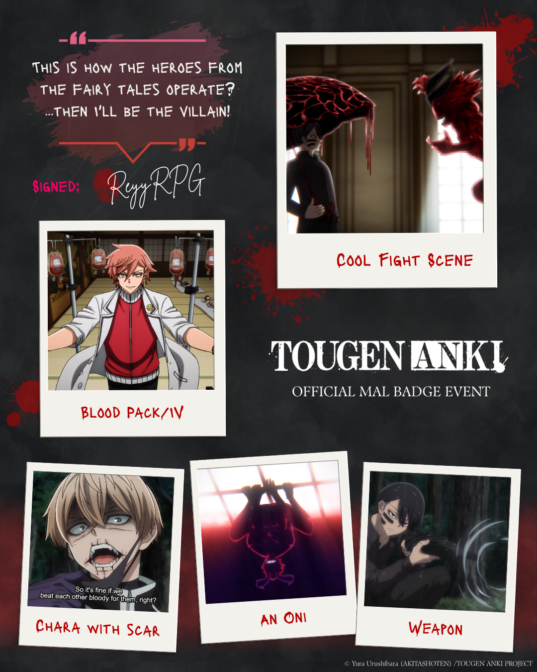 Glad this event got me watching this anime, its so good 1 - Cool Fight Scene: episode 2 2 - Blood Pack/IV: episode 5 3 - Character with a Scar: episode 3 4 - An Oni: episode 1 5 - A Weapon: episode 4 |