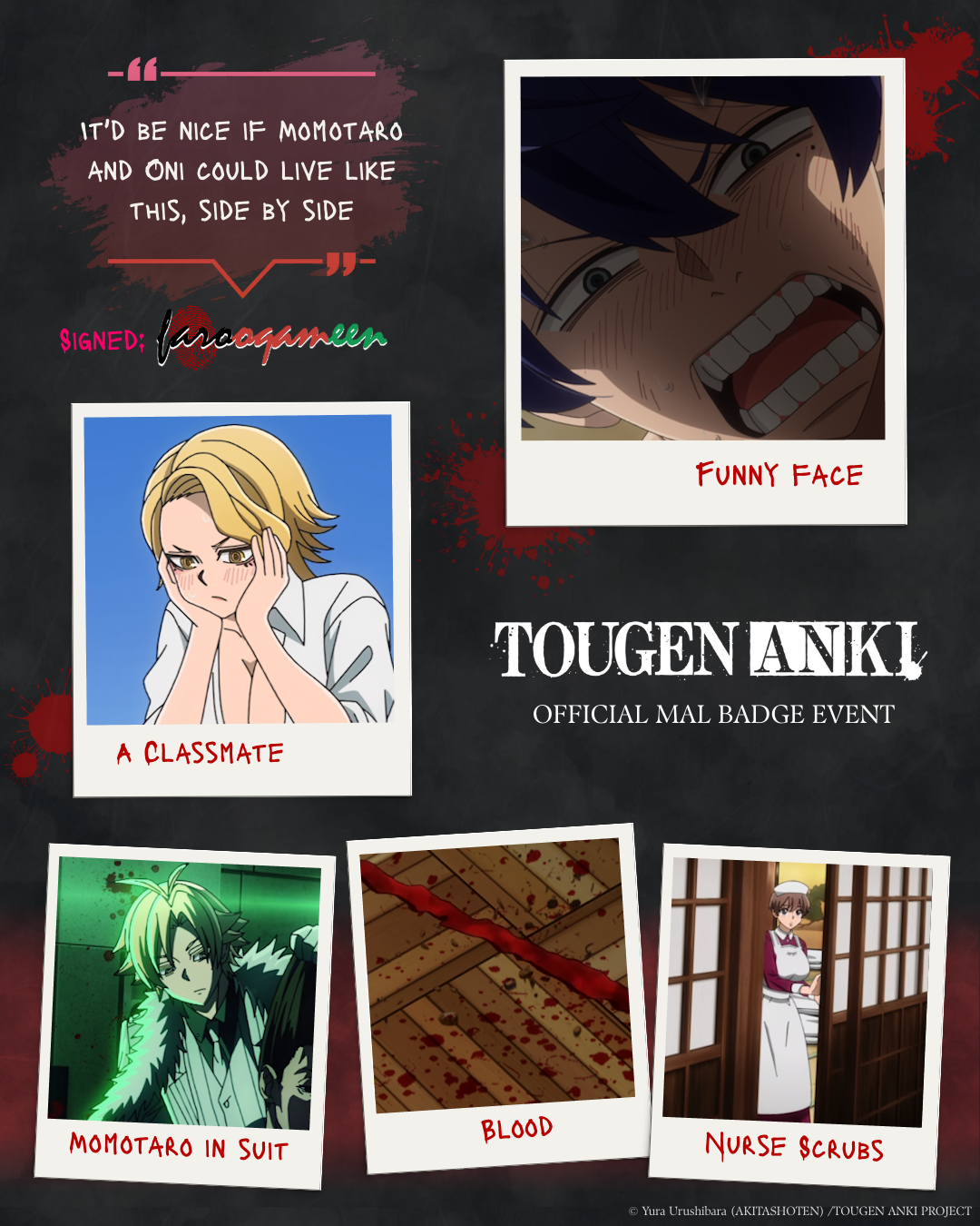 It was undoubtedly an excellent challenge and a great time-killer. I had so much fun that I couldn't complete just one card and ended up completing all three. I hope there are more challenges like this in the future. 1 - Cool Fight Scene: episode 2 2 - Blood Pack/IV: episode 5 3 - Character with a Scar: episode 3 4 - An Oni: episode 4 5 - A Weapon: episode 1 1 - Funny Face: episode 2 2 - A Classmate of Shiki's: episode 3 3 - Momotaro in a Suit: episode 4 4 - Blood: episode 1 5 - Nurse Scrubs: episode 5 1 - Favorite Oni: episode 5 2 - Blood Eclipse Release: episode 3 3 - Classroom: episode 2 4 - Rollerblades: episode 1 5 - Temple: episode 5 |
