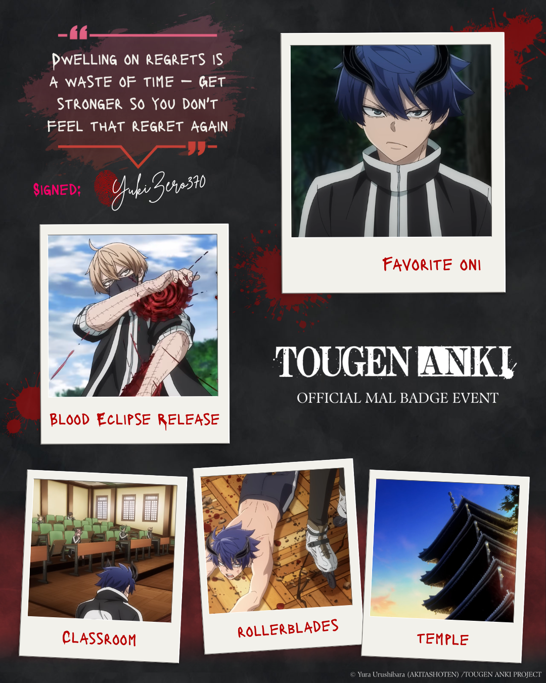 Looking forward to seeing this type of event with future shows! 1 - Cool Fight Scene: episode #2 2 - Blood Pack/IV: episode #5 3 - Character with a Scar: episode #3 4 - An Oni: episode #1 5 - A Weapon: episode #1 |