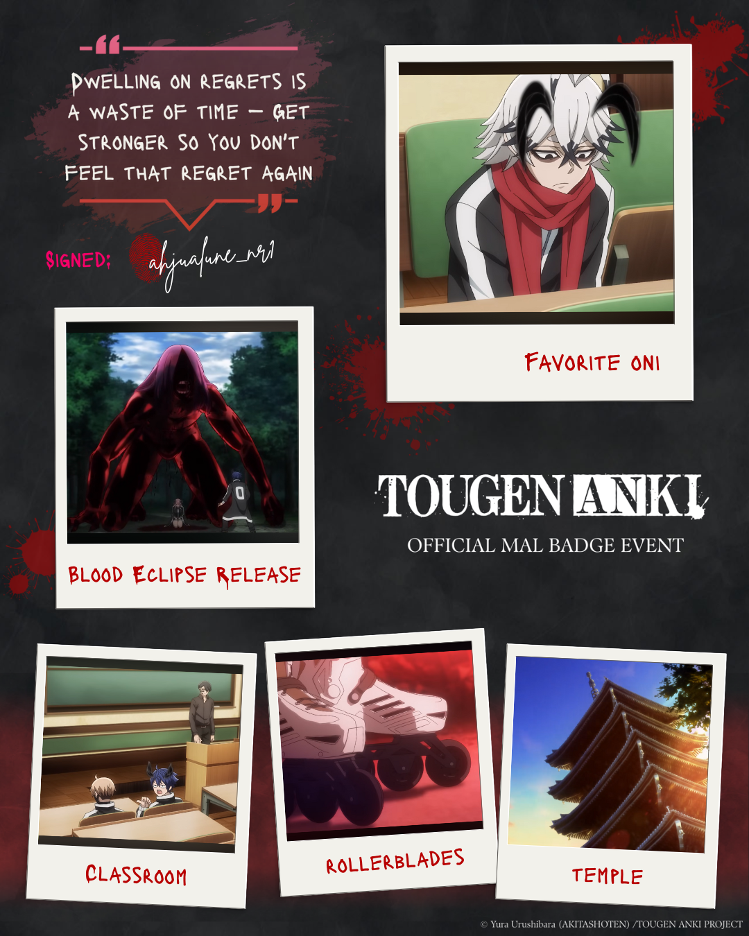 Entry: 1 - Cool Fight Scene: episode 3 2 - Blood Pack/IV: episode 5 3 - Character with a Scar: episode 1 4 - An Oni: episode 7 5 - A Weapon: episode 1 |