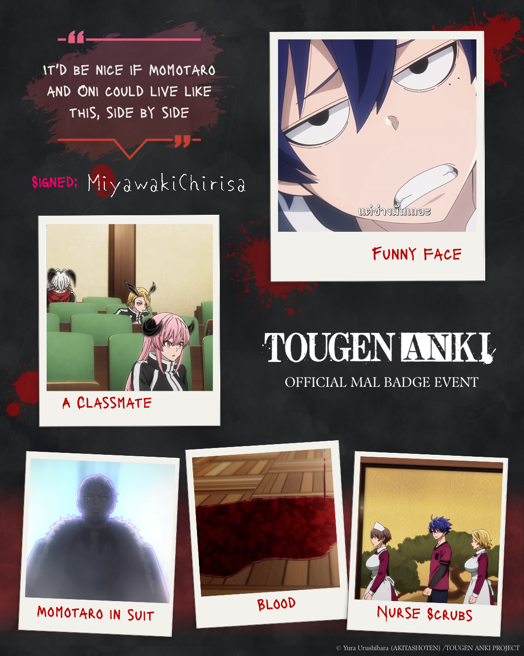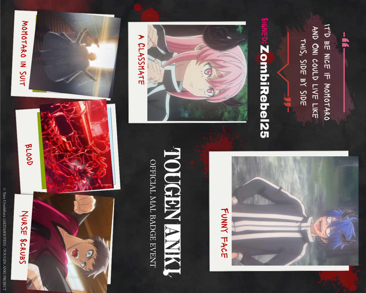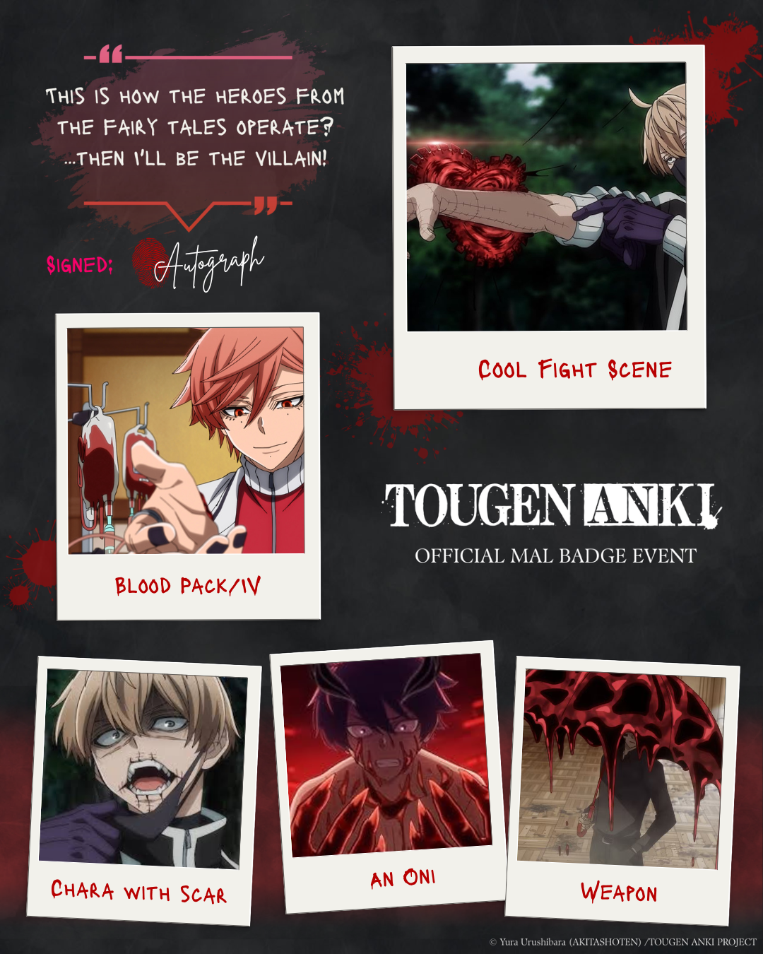 Very cool event, I had the anime progress paused within the last three episodes and this made me go watch those. 1 - Cool Fight Scene: episode #3 2 - Blood Pack/IV: episode #5 3 - Character with a Scar: episode #3 4 - An Oni: episode #1 5 - A Weapon: episode #2 |