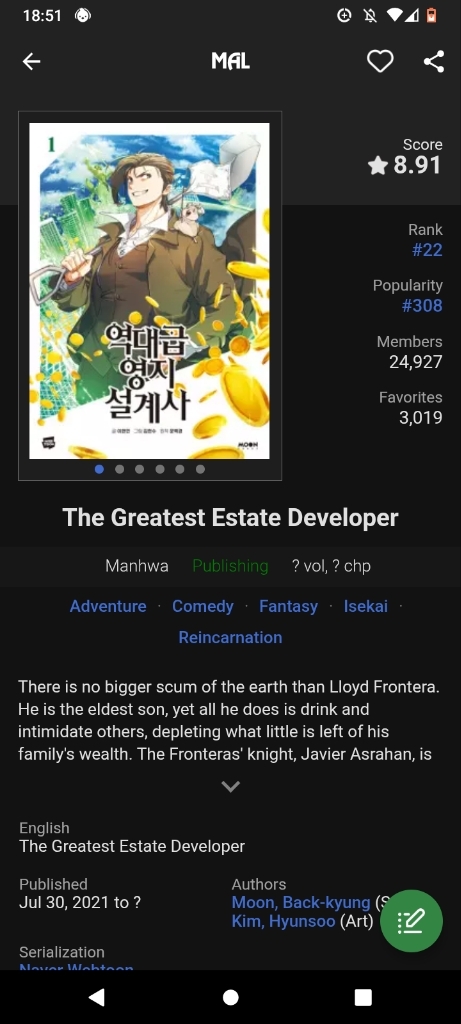Please change the status of the manhwa "The Greatest Estate Developer". It's already over with 210 caps and the epilogue is like a special cap 210.5. ![]() |