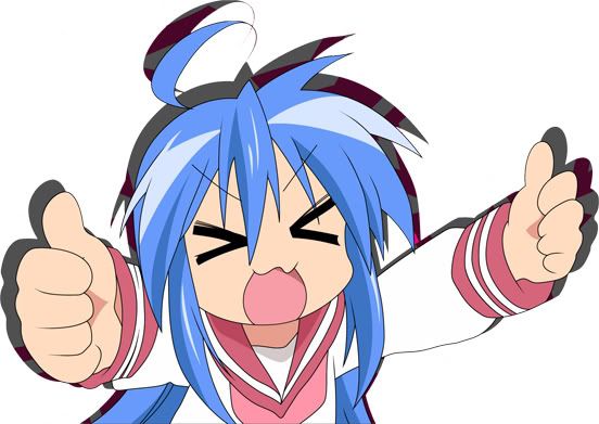 | name of character: Konata Izumi where is the chara from: Lucky Star why do i think i am the character: We both love anime and consider ourselves Otakus, we both also love video games, are immature, relate things to video games and anime, like cosplay, and think of Flat Chest as a Status symbol. lol. banner: Yes, please!!! Banner size: any size. Pictures: ![]() ![]() |