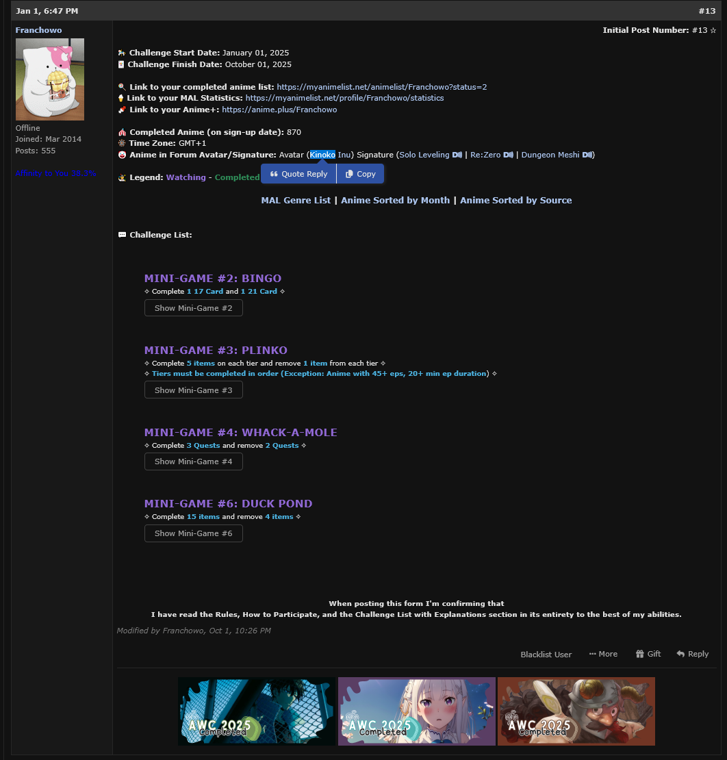 Initial Post Number: #152✰ 🌟 Challenge Start Date: January 07, 2025 🌟 Link to your completed anime list: CMPL | AWC 2025 🌟 Link to your MAL Statistics: Stats 🌟 Link to your Anime+: Anime+ 🌟 Completed Anime (on sign-up date): 1,871 🌟 Time Zone: GST 🌟 Anime in Forum Avatar/Signature: Tian Guan Cifu 🌟 Legend: Watching - Completed - Inactive/Plan to Watch 💬 Challenge List: