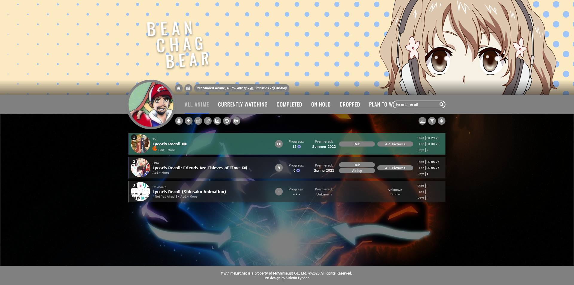 Initial Post Number: #118 ☼ ⏳ Challenge Start Date: March 14, 2025 ⌛ Challenge Finish Date: December 11, 2025 📜 Link to your completed anime list: Completed Anime List 🍦 Link to your MAL Statistics: MAL Statistics 📜 Link to your Anime+: Anime+ 🔍 Completed Anime (on sign-up date): 953 🌐 Time Zone: GMT-5 🔎 Anime in Forum Avatar/Signature: Link ✏️ Legend: Watching - Completed - Inactive/Plan to Watch 💬 Challenge List: