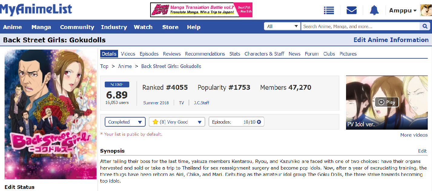 Initial Post Number: #1224# 🔶 Challenge Start Date: Jan 03, 2019 🔷 Challenge Finish Date: 31 Dec, 2019 🔖 Link to your completed anime list: https://myanimelist.net/animelist/Fittglitter?status=2 🔖 Link to your Anime+: http://graph.anime.plus/Fittglitter/profile ✨ Completed Anime (at sign-up): 67 ✨ Time Zone: UTC/+1 🔺 Difficulty: Novice 💠 Legend: Watching - Completed - Inactive/Plan to Watch 🛡️ Challenge list: [list=1] Novice — 31 total items | 22/20 required 🛡️ Finish Date: 15 July [*][Started: 29 March] [Finished: 27 April] (N.01) Watch an ONA Bounen no Xamdou [*][Started: DATE] [Finished: DATE] (N.02) Watch an anime with 10 or more episodes that are each 15 minutes or less ANIME_TITLE [*][Started: DATE] [Finished: DATE] (N.03) Watch a Music type anime ANIME_TITLE [*][Started: 24 march] [Finished: 14 May (N.04) Watch an award winning anime Zombieland Saga [*][Started: 17 Jan] [Finished: 29 march] (N.05) Watch a listed noitaminA or YATP series Yakusoku No Neverland [List used: https://myanimelist.net/forum/?topicid=1519005] [*][Started: 17 feb] [Finished: 17 feb] (N.06) Watch an anime by a director that made one of your Favorite Anime PES: Peace Eco Smile [Favorite anime: Kakegurui | Director: Hayashi, Yuuichirou ] [*][Started: DATE] [Finished: DATE] (N.07) Watch an anime in which your favorite character's voice actor participated ANIME_TITLE [Favorite character: | Voice actor: ] [*][Started: 16 Jan] [Finished: 18 Jan] (N.08) Watch an anime that began airing between 2010 and 2015 tasogare Otome X Amnesia [*][Started: 7 May] [Finished: 8 May] (N.09) Watch an anime that began and finished airing during 2018 Uchi No Maid ga Uzasugiru [*][Started: 27 April] [Finished: 7 maj] (N.10) Watch an anime adapted from a Visual Novel or Light Novel Clannad [*][Started: 5 June [Finished: 6 June] (N.11) Watch an anime adapted from a Card Game or Game God Eater [*][Started: 17 Feb] [Finished: 27 April] (N.12) Watch an Original anime Kill la Kill [*][Started: DATE] [Finished: DATE] (N.13) Watch an anime with more than 16 minutes per episode and a score of or below 6.00 ANIME_TITLE [Score when finished: ] [*][Started: 3 Jan] [Finished: 14 Jan] (N.14) Watch an anime with more than 16 minutes per episode and a score of or above 8.00 Clannad: [Score when finished: 8.18] [*][Started: 19 May ] [Finished: 23 May] (N.15) Watch an anime with more than 16 minutes in total and a popularity lower than #700 Kuroshitsuji: Book of Circus [Popularity when finished: #464] [*][Started: 11 May] [Finished: 14 July] (N.16) Watch an anime with 2 or more main characters where one is as a human child Dororo [Child: Dororo] [*][Started: 7 Feb] [Finished: 15 July] (N.17) Watch an anime with a main character that is a professional in their field Yakitate!! Japan [Character: Azuma | Profession: Baker ] [*][Started: jan 25] [Finished: 14 Feb] (N.18) Watch an anime with more than 16 minutes in total and rated PG-13 Jungle wa Itsumo Hare nochi Guu [*][Started: 22 June ] [Finished: 25 June] (N.19) Watch a listed Mythology or Time Travel themed anime Mahoutsukai no Yome [Theme: Mythology] [*][Started: 5 May] [Finished: 7 May] (N.20) Watch a listed GAR or Magical Girl themed anime Mahou Shoujo Ikusei Keikaku [Theme: Magic Girl] [*][Started: 9 April] [Finished: 9 April] (N.21) Watch an anime with more than 16 minutes in total and tagged as Ecchi and/or Harem Koe de Oshigoto! The Animation [*][Started: DATE] [Finished: DATE] (N.22) Watch an anime with more than 16 minutes in total and tagged as Game and/or Sports ANIME_TITLE [*][Started: 24 Jan] [Finished: Jan 25] (N.23) Watch an anime with more than 16 minutes in total and tagged as Mystery, Psychological and/or Thriller Shiki [*][Started: DATE] [Finished: DATE] (N.24) Watch an anime suggested by MAL or by Anime+ ANIME_TITLE [Screenshot of the suggestion: ] [*][Started: DATE] [Finished: DATE] (N.25) Watch an anime Featured in an article from 2018 onward ANIME_TITLE [Article: ] [*][Started: 24 march] [Finished: 27 march] (N.26) Watch an anime with a full English title Gosick [*][Started: DATE] [Finished: DATE] (N.27) Watch an active staff member's favorite anime with 10 episodes or more ANIME_TITLE [Username: | Profile's link: ] [*][Started: 15 May] [Finished: 19 May] (N.28) Watch an anime that finished airing with more than 10 episodes and has a synopsis by MAL Rewrite Kuroshitsuji [*][Started: 17 Jan] [Finished: 23 Jan] (N.29) Watch any anime recommended to your Favorite Anime Shinsekai yori [Favorite anime: Made in Abyss] [*][Started: 6 june] [Finished: 6 june] (N.30) Watch an anime with 3 or more main characters with unnatural hair colors No Game No Life: Zero [*][Started: DATE] [Finished: DATE] (N.31) Watch an anime from a random TVTropes ANIME_TITLE [Trope's link: | Trope's name: ] Apprentice — 37 total items | 3/20 required 🛡️ Finish Date: DATE [*][Started: DATE] [Finished: DATE] (Ap.01) Watch a stand-alone OVA ANIME_TITLE [*][Started: 1 Augusr] [Finished: 1 August] (Ap.02) Watch a Movie with a duration of 90 minutes or more Yoake Tsugeru Lu no Uta [*][Started: DATE] [Finished: DATE] (Ap.03) Watch the last movie of a Movie-Series ANIME_TITLE [*][Started: DATE] [Finished: DATE] (Ap.04) Watch an anime with 35 or more episodes that are each 15 minutes or less ANIME_TITLE [*][Started: DATE] [Finished: DATE] (Ap.05) Watch an anime with 20 or more episodes that are each 16 minutes or more ANIME_TITLE [*][Started: 15 July] [Finished: 19 July](Ap.06) Watch an anime by a studio you haven't seen anything from Inu X Boku SS [Studio: David Production ] [*][Started: DATE] [Finished: DATE] (Ap.07) Watch an anime by a studio with 3 to 30 anime in MAL's database ANIME_TITLE [Studio: ] [*][Started: DATE] [Finished: DATE] (Ap.08) Watch an anime with a voice actor that worked on 5 or less series ANIME_TITLE [Voice Actor link: ] [*][Started: DATE] [Finished: DATE] (Ap.09) Watch an anime in which your favorite voice actor was part of the main cast ANIME_TITLE [Voi