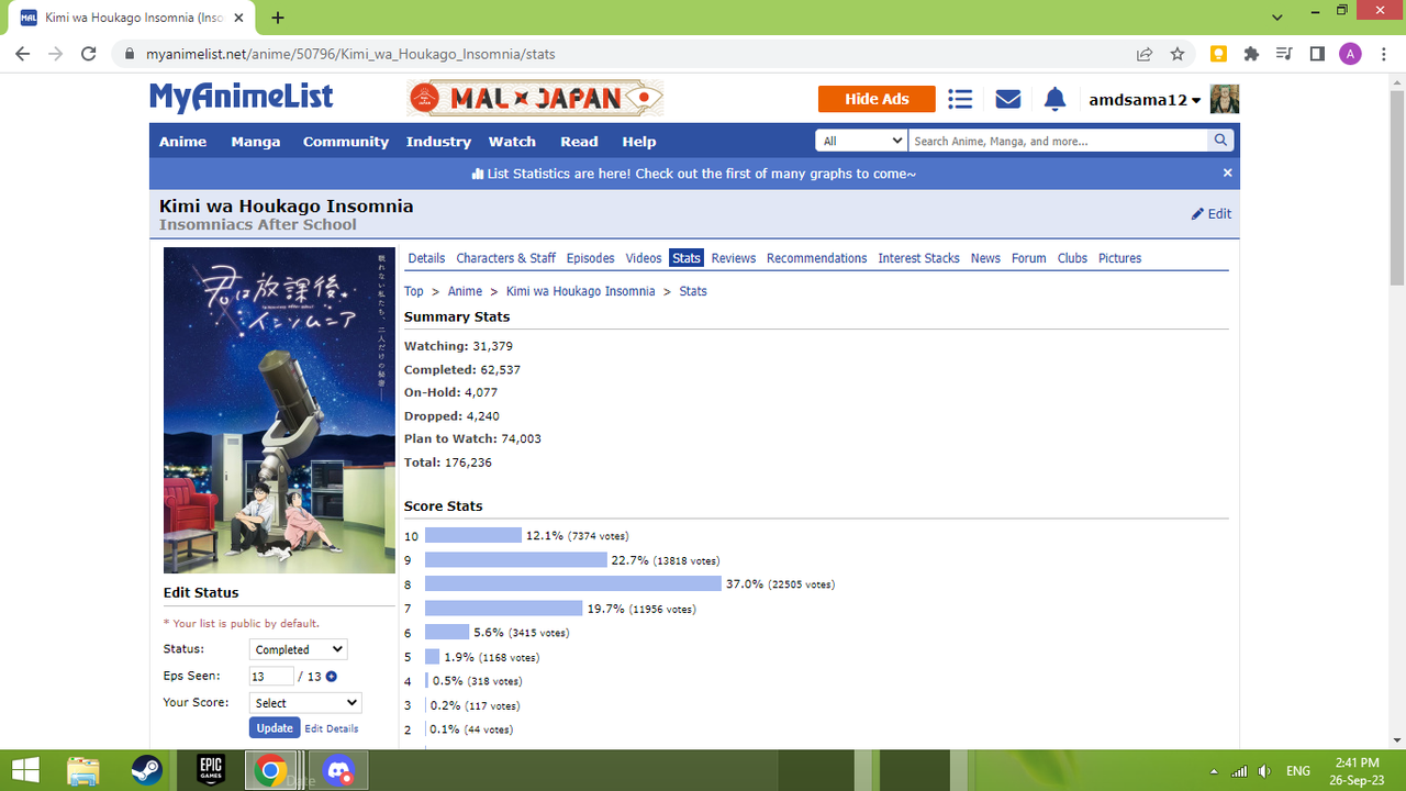 | @AWC_mod Journey Completed! ๐๏ธ Challenge Start Date: January 2, 2023 ๐ฐ Challenge Finish Date: September 3, 2023 ๐ Link to your completed anime list: https://myanimelist.net/animelist/KuraikoDesu?status=2 ๐บ๏ธ Completed Anime (at sign-up): 1,214 ๐ Completed Anime (at turn-in): 1,476 โ๏ธ Sign-up form Initial Post Number: 49 ๐ Link to your sign-up form: https://myanimelist.net/forum/?topicid=2067484#msg68395876 ๐ฒ Route #: #18 ๐ฒ Romance Route #: All ๐ Do you want your challenge inspected? Yes ๐ Turning-In CHECKLIST (Don't remove once it's done)