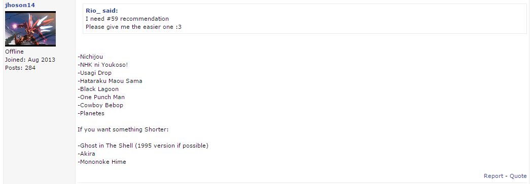 Initial Post Number: <1754> ๐ฎ Challenge Start Date: January 16, 2017 ๐ง Challenge Finish Date: TBA ๐ Link to your list: http://myanimelist.net/animelist/Rio_ ๐ก Completed Anime (at sign-up): 126 ๐ก Bingo Card #: 42 ๐ก Difficulty: Major ๐ก Pattern: Diamond ๐ Legend: Watching - Completed - Inactive/Plan to Watch ๐ Challenge list: