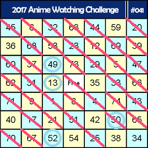 Initial Post Number: 1774 ๐ฎ Challenge Start Date: January 01, 2017 ๐ง Challenge Finish Date: December 03, 2017 ๐ Link to your list: My List :3 ๐ก Completed Anime (at sign-up): 290 ๐ก Bingo Card #: 093 ๐ก Difficulty: Master of TV, Emperor ๐ก Pattern: Full Card ๐ก Restriction: TV Types Only ๐ Legend: Watching - Completed - Inactive/Plan to Watch ๐ Challenge list: