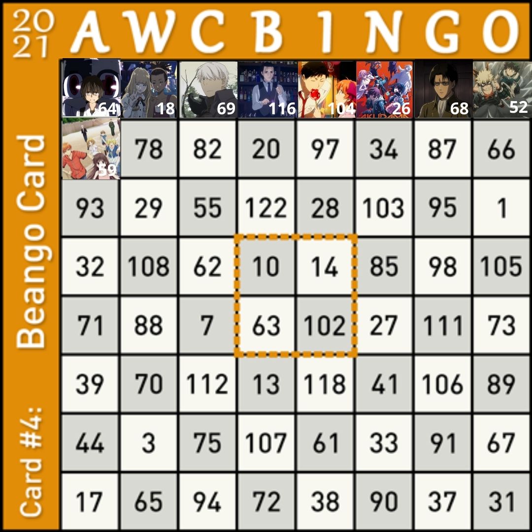 | @AWC_mod BINGO! π· Challenge Start Date: January 03, 2021 πΆ Challenge Finish Date: May 30, 2021 π£ Link to your completed anime list: https://myanimelist.net/animelist/hinagatari?status=2 β° Completed Anime (at sign-up): 1,549 β° Completed Anime (at turn-in): 1,657 π Sign-up form Initial Post Number: #38 π Link to your sign-up form: https://myanimelist.net/forum/?topicid=1885985&show=0#msg61620149 π© Card NUMBER: #02 π© Card Level: Bingo Legend π© Restriction: Endurance π Do you want your challenge inspected? Yes π Do you want your challenge inspected as Jackpot!? Yes π Turning-In CHECKLIST (don't remove once it's done)