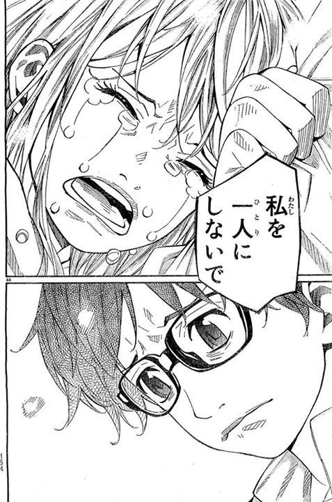 the surgeons seemingly panicked (speed lines and all), Kaori appearing next to Kousei right after, the emphasis on her life line as well as the surgeons stopping and showing us the time.. when she started disappearing and Kousei obviously feeling all of this :( As much as i hate it (and i seriously hope am wrong) with all of this, Kousei saying goodbye and the letter this is it :( But even then i cannot help but believe she's alive, i know it's just denial but it sure is hard. The way Naoshi's portraying emotions is just amazing, cannot help but feel like crying checking this raw, truely a master piece. |