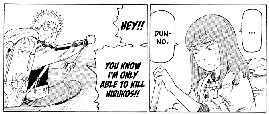 The adaptation so far is pretty strong, but I can't help but feel like the artstyle (and staging choices) sacrifices a lot of the manga's own's comedic elements. Ishiguro is great at funny faces, and it pains me to lose stuff like this in the raft scene It's clear they want to do more than just a panel-by-panel recreation or something like that, which is totally respectable, but there is just something so charming and endlessly amusing about Ishiguro's art that I don't think the anime is replicating. They were definitely channelling a lot of that manga energy into the confession scene, though. That was great, and it was even "anime original." More of that, please. |