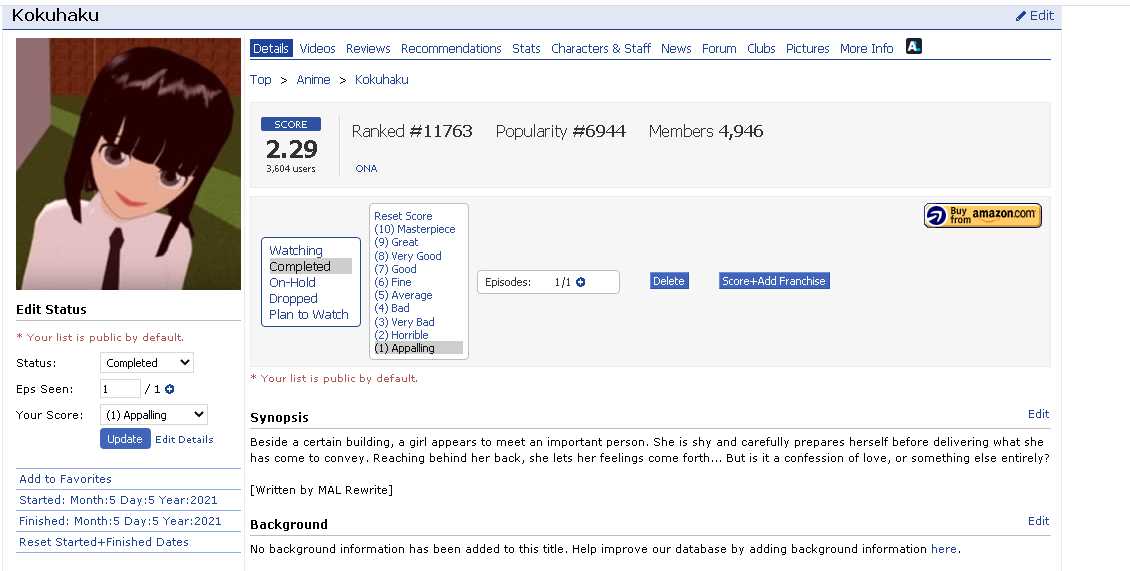 | @AWC_mod BINGO! π· Challenge Start Date: May, 4, 2021 πΆ Challenge Finish Date: September, 2, 2021 π£ Link to your completed anime list: https://myanimelist.net/animelist/ghostwead?status=2 || AWC2021 Challenge Tag β° Completed Anime (at sign-up):44 β° Completed Anime (at turn-in):58 π Sign-up form Initial Post Number: #1957 π Link to your sign-up form: https://myanimelist.net/forum/?topicid=1885985&show=1900 π© Card NUMBER: #9 π© Card Level: β Bingo Rookie π© Restriction:N/A π Do you want your challenge inspected? Yes π Do you want your challenge inspected as Jackpot!? Yes π Turning-In CHECKLIST (don't remove once it's done) Have I entered all dates correctly following the provided format? YES γ— Are they in a consistent format throughout my sign-up and turn-in forms? YES γ— Does my overall Challenge Start Date match the start date of the very first anime I used? YES γ— Does my overall Challenge Finish Date match the finish date of the last anime I used? YES Do all of my anime titles match the official title on their MAL pages? YES γ— Do the anime links I've provided lead to the correct pages? YES Have I provided all necessary screenshots and extra information for the items that need them? YES γ— Do the screenshots I've taken show my username somewhere on-screen? YES /sometime the anime/user cant fit the screen, so i made sure to include the Link on the screenshots For all items where a screenshot or extra information was needed, did I put it in square brackets on a separate line below the anime title? YES Have I modified the format of the item list provided by the challenge team? No changes to color/format γ— If so, please view the original sign-up code to make sure your list follows the exact same format. When posting this form I'm confirming that I have read the Rules, How to Participate, and the Item's Explanations sections in its entirety and that I have completed the challenges to the best of my abilities. |