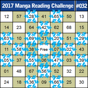 Initial Post Number: <298> ๐ฎ Challenge Start Date: 1/11/17 ๐ง Challenge Finish Date: TBA ๐ Link to your list: https://myanimelist.net/mangalist/Riyuu_ ๐ก Completed Manga (at sign-up): 22 ๐ก Bingo Card #: #079 ๐ก Difficulty: Rookie ๐ก Pattern: Checkerboard ๐ Legend: Reading - Completed - Inactive/Plan to Read ๐ Challenge list: 1-20.Read a manga published between the 1970s and the 1980s-Manga= Kozure Ookami Start date- Finish date- 2-6.Read a gekiga manga-Manga= Abandon the Old in Tokyo Start date-1/14/17 Finish date-1/14/17 3-55.Read a Sci-Fi, Space or Mecha manga-Manga=20th Century Boys Start date- Finish date- 4-65.Choose a manga from the predictive search using a generated random word-Manga= Death Note Start date- Finish date- 5-43.Read a manga that has a main character that is a professional in his field-Manga= Start date- Finish date- 6-60.Read a manga recommended to you by another Manga Reading Challenge participant in the discussion thread-Manga= Start date- Finish date- 7-45.Read a manga that takes place in Japan-Manga= Nana Start date- Finish date- 8-23.Read a manga published between the 2000s and the 2010s-Manga= Blue Exorcist Start date- Finish date- 9-49.Read a manga centered around folklore or mythology-Manga= Tora-neko Folklore Start date- Finish date- 10-17.Read a manga published in the same magazine in which your favorite one was serialized-Manga= Bakuman. Start date- Finish date- 11-54.Read a Super Powers, Fantasy or Supernatural manga-Manga=Berserk Start date- Finish date- 12-68.Choose a random trope from TVTropes and read a manga listed under the trope-Manga= Bleach Start date- Finish date- 13-34.Read a manga ranked in the top 1000s-Manga= Vagabond Start date- Finish date- 14-53.Read a Drama, Action or Adventure manga-Manga= Kingdom Start date- Finish date- 15-1.Read a one-shot-Manga= Tokidoki Start date- Finish date- 16-46.Read a manga that takes place outside of Japan-Manga= Kuroshitsuji Start date- Finish date- 17-63.Read a manga that was recently reviewed-Manga= Start date- Finish date- 18-32.Read a manga with a score of or below 6.0 in MyAnimeList-Manga= Venus Kiss Start date- Finish date- 19-24.Read a manga that started publishing after 2010-Manga= To Love-Ru Start date- Finish date- 20-31.Read a manga that has inspired or been adapted to cd drama-Manga= Shuffle! Start date- Finish date- 21-13.Read a manga serialized in a shoujo magazine-Manga= Hirunaka no Ryuusei Start date- Finish date- 22-57.Read a Dementia, Horror, Demons or Vampire manga-Manga= Blame! Start date- Finish date- 23-3.Read a web or 4-koma manga-Manga= Killing Stalking Start date- Finish date- 24-16.Read a manga serialized in a seinen magazine-Manga= Prison School Start date- Finish date- 25-5.Read an award-winning manga- Manga= The Seven Deadly Sins(Kodansha Comics USA since March 25, 2014) Start date- Finish date- |