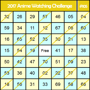 Initial Post Number: #401 The 2017 Anime Watching Challenge 17/49 Completed | In Progress | Planned Challenge Start Date: January 7th 2017 Challenge Finish Date: Link to your list: Here Completed Anime (at sign-up): 640 Bingo Card: #042 Difficulty: Emperor Pattern: Full Restrictions: TV Type Only Challenge list: