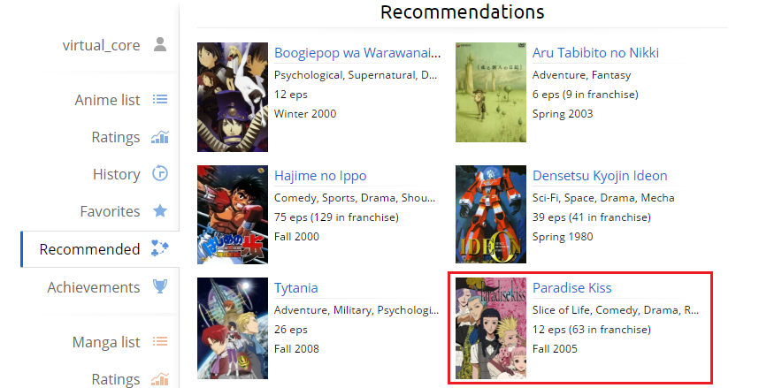 » fav finished 05/50 โก type 01 • watch an ona or stand-alone ova : Eve no Jikan 02 • watch a movie : Colorful 04 โ watch a music type anime : Shelter 07/10 05 • watch an award winning anime : Shirobako โก creators 09 โค watch an anime with a character voiced by one of your favorite voice actors : Working!! (todoroki yachiyo by Eri Kitamura) 10 • watch an anime by a studio with 3 to 50 anime in mal's database : Dagashi Kashi (shogakukan) โก years 13 • watch an anime which began airing the same year you joined mal : Durarara!!x2 Shou 14 • watch an anime which began airing between 1917 and 1959 : Koneko no Studio 16 • watch an anime which began airing between 1980 and 1989 : Urusei Yatsura 17 • watch an anime which began airing between 1990 and 1999 : Ojamajo Doremi 19 โ watch an anime that aired only during 2016 : Yuri on Ice 07/10 20 • watch an anime broadcast on a weekday : Kuragehime (fridays at 00:45 (jst)) 21 • watch an anime broadcast on a weekend : ReLife (saturdays at 00:00 (jst)) โก adaptations 22 • watch an anime with 11 episodes or more : Gekkan Shoujo Nozaki-kun 25 • watch an anime with 50 episodes or more : Touch 26 • watch an anime that has been adapted to live action : Isshuukan Friends 28 • watch an anime adapted from a visual novel, card game or game : Air 29 โ watch an anime adapted from a book, picture book, novel or light novel : Yahari Ore no Seishun Love Comedy wa Machigatteiru (light novel) 08/10 30 • watch an anime adapted from a web manga, digital manga or 4-koma manga : Nana โก stats 31 • watch an anime adapted from a manga with a score of 8.0 or higher : Nodame Cantabile 33 โค watch a completed anime with a score of or above 8.00 : Mushishi 35 • watch an anime with less than 5,000 completed members : Winter Sonata 36 • watch an anime with more user in "plan-to-watch" than "completed" : Gi(a)rlish Number โก tags, themes & demographics 38 • watch an anime with a main cast primarily of one gender : Danshi Koukousei no Nichijou 39 • watch an anime with adults as the main cast : Kuuchuu Buranko 45 โ watch an anime that combines one of your favorite and least favorite genres : High School DxD (fav genre : romance • hated genre : ecchi) 02/10 46 • watch a gourmet, superhero or magical girl themed anime : Mahou Shoujo Pretty Sammy (1996) (magical girl) 47 โ watch an anime tagged as shounen or seinen : Noragami (shônen) 07/10 48 • watch an anime tagged as shoujo or josei : Itazura na Kiss (shôjo) 51 • watch an anime tagged as drama, slice of life and/or romance : Gosick (romance, drama) 53 • watch an anime tagged as dementia, demons, horror and/or vampire : kamisama hajimemashitaโ (demon) 54 โค watch an anime tagged as mystery, psychological and/or thriller : Monster (psychological) 55 • watch an anime tagged as mecha, military, police and/or space : Cowboy Bebop (space) 57 • watch an anime tagged as cars, game, parody and/or sports : Ping Pong the Animation (sports) 58 • watch an anime tagged as kids, magic and/or music : The iDOLM@STER (music) โก challenge & mal related 59 • watch an anime recommended to you in the challenge discussion thread : Haikyuu!! (here) 60 • watch an anime that another user has completed for this challenge : 61 • watch an active staff member's favorite anime : ef: A Tale of Melodies (jinbou) 62 • watch an anime that hasn't been reviewed : gabriel DropOut 65 • choose an anime from the predictive search using your username : Plastic Memories 66 • watch an anime suggested by anime+ or by mal : Ouran Koukou Host Club (link here) โก miscellaneous 67 • watch an anime that starts with the same second letter as your username : Sakura Trick 68 • watch an anime with a number in it's title : 3-gatsu no Lion 69 • watch an anime that has a one word title : Amanchu! 70 • choose a random trope from tvtropes and watch an anime listed under the trope : Ookami to Koushiryou 71 • watch an anime with a main character that doesn't have a natural hair color : Heartcach Precure 72 • watch an anime that you can finish in one day : Flying Witch 74 • watch an anime recommended to a favorite anime listed in your profile : Shoujo Kakumei Utena |
