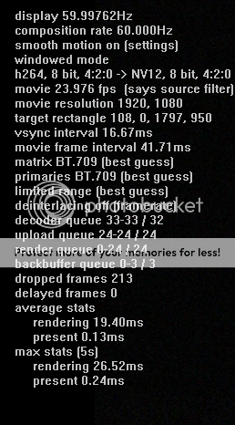 CanalDigger said: Is this because I am streaming it from my NAS, or maybe I just made some bad configs? Thanks for the kind words. It's highly unlikely your NAS has anything to do with it, I'm fairly positive it's bad settings and you just need to look at the rendering time to make that assumption (19.40ms is pretty high). Give me your specs (GPU, OS) or the name of the desktop/laptop you're using with the preset for madVR so I can look a little more into it and give you some opinions on optimal settings. Take notice you're also using smooth motion, and since it's a experimental feature, there's a chance it might be the evil deed that's causing the dropped frames. |