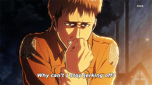 | Watching Erin nearly bite his hand off...*shudder* Jean looked good this episode. :o I'm coming to like Erwin x Levi more. Bet the last episode is going to be tough to watch. :/ Unless they leave it at a cliffy. omg. |