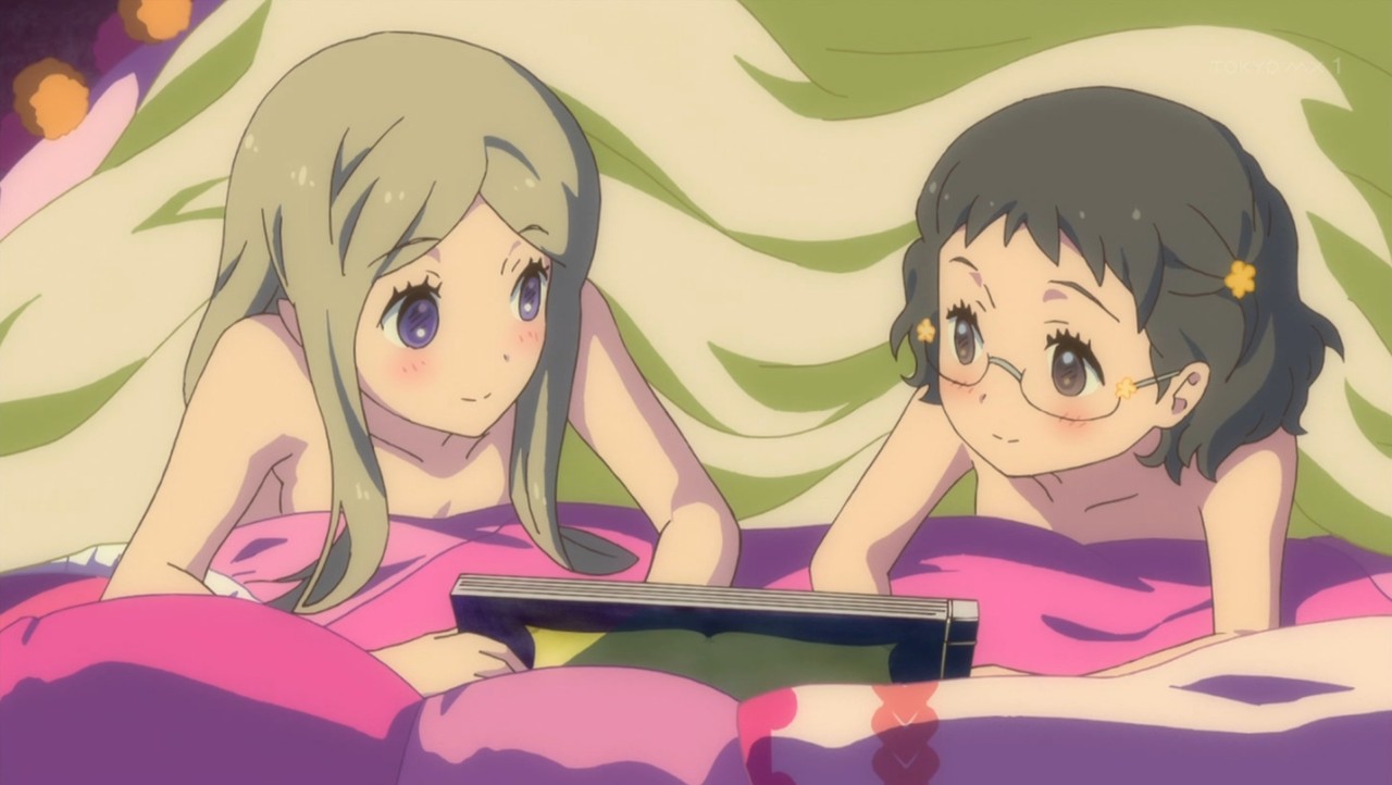 | Uh, yeah.. We were just reading . . .. . .Yeah, right... So, are Kureha and Sumika friends or lovers? .Here are some relevant scenes: Under the blanket together, in front of the fireplace: http://livedoor.blogimg.jp/anico_bin/imgs/a/5/a531cf6f.jpg Together on the bed, feet sticking out of comforter: http://livedoor.blogimg.jp/anico_bin/imgs/e/4/e4bdeba8.jpg Together on the bed, reading the story book together: http://livedoor.blogimg.jp/anico_bin/imgs/f/8/f8420335.jpg Even before the series first aired, there was background information about each character posted on the official website. Probably many of you would prefer not to know all of these things, but instead figure them out on your own. However, what it says is . . . . . . when they describe Kureha, they talk about her relationship with Sumika. They are both "friends" ( 友人 / tomohito ) and also "lovers" ( 恋人 / koihito ). The phrase 恋人 can also be translated as "sweetheart". In a heterosexual couple, the girl would be the 恋人 of the guy. And vice-versa. One thing that is clear is that 恋人 does not imply that the couple has "done it" or "gone all the way" or "gotten to fourth base". Stated more completely, what it says is that Kureha has opened up her heart to Sumika both as a friend and also as a lover. To see this info (in Japanese) for yourself, just go to this webpage: http://yurikuma.jp/chara.html Then scroll down and click on the top-right rectangle: 椿輝紅羽 I believe that, in the entire history of "Central-element Yuri" broadcast TV anime series, there is no previous case when two sympathetically-presented main characters ever got past first base. "Bad girls" might be seen doing "bad things". A "bad girl" might be seen doing "bad things" to a "good girl". There might be some background characters doing some stuff. I am ruling out OVAs and so on that weren't actually broadcast on TV. Given that Ikuhara surely knows this, there is no way that Kureha and Sumika actually "did it". Right? They are both good girls. We fell in love with both of them in Episode 1 because of their purity. I mean, there's no way. Right? - - - - - - - - You can't see her wearing her iPhone earphones under that white bonnet, but Kureha tweeted that the OP extended version (length = 04:25) is now available for download on iTunes for only 250 Yen. (Sorry, but I couldn't find a webpage written in English, and I have never downloaded iTunes songs myself before.) https://itunes.apple.com/jp/album/tvanime-yuri-xiong-lan-opuningutema/id961500551 Or else you can wait for Feb 25th when the same song goes on sale as a CD, along with three other tracks, such as the no-vocal version of the extended OP. It looks like you can order it on this English-language webpage here. Ordering outside of Japan should not be a problem, since I purchased from them recently. http://www.amazon.co.jp/dp/B00QPIMT96/axive-22 |