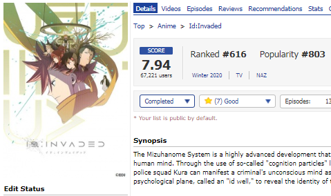 Initial Post Number: #657✩ 🔷 Challenge Start Date: January 11, 2020 🔶 Challenge Finish Date: August 01, 2020 📣 Link to your completed anime list: https://myanimelist.net/animelist/Eyth?status=2 📣 Link to your Anime+: http://graph.anime.plus/Eyth/profile 🚩 Completed Anime (at sign-up): 92 🚩 Time Zone: CET 🔺 Difficulty: Diamond Medalist 🔻 Restriction: Neat Freak 🥇 Anime in Forum Set: N/A 🥇 Legend: Watching - Completed - Inactive/Plan to Watch 🛡️ Challenge list: