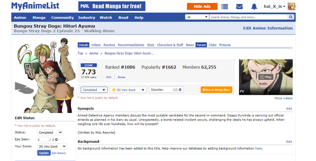 Initial Post Number: #671 ° 🔷 Challenge Start Date: January 05, 2020 🔶 Challenge Finish Date: MONTH DAY, YEAR (example: December 01, 2020; KEEP THIS FORMAT) 📣 Link to your completed anime list: https://myanimelist.net/animelist/bvyans?status=2 📣 Link to your Anime+: http://graph.anime.plus/bvyans/profile 🚩 Completed Anime (at sign-up): 319 🚩 Time Zone: EST/UTC-4 🔺 Difficulty: Gold Medalist 🔻 Restriction: N/A 🥇 Anime in Forum Set: N/A 🥇 Legend: Watching - Completed - Inactive/Plan to Watch 🛡️ Challenge list: