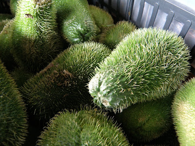 I also know of a fruit in Mexico that came to my mind based on how similar both durian and the fruit in Mexico are. That fruit is chayote which is green in color and also has a rough spiky texture. http://3.bp.blogspot.com/_0OBNDLkitMI/SqPyMybeahI/AAAAAAAAArI/xf8o-bHSqA0/s400/P8070609.jpg